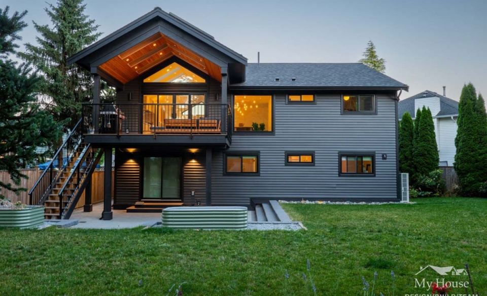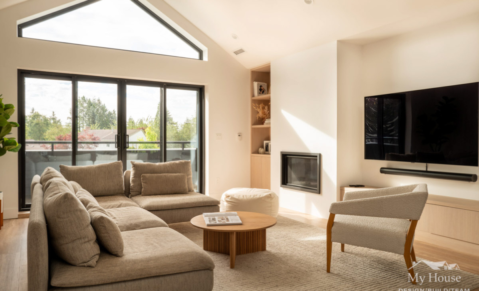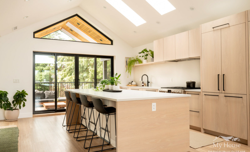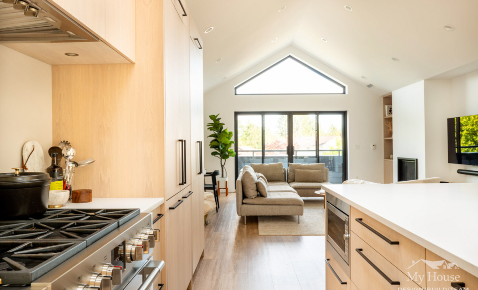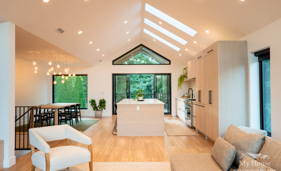 Upstairs, the young family enjoys a spacious 3-bedroom layout with an open-concept kitchen, dining, and living space. The kitchen was repositioned to face the rear yard, maximizing natural light and creating a strong connection to the outdoors. A vaulted ceiling and skylights further enhance the home’s sense of openness, while a covered deck off the kitchen allows for year-round outdoor enjoyment.
