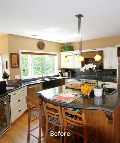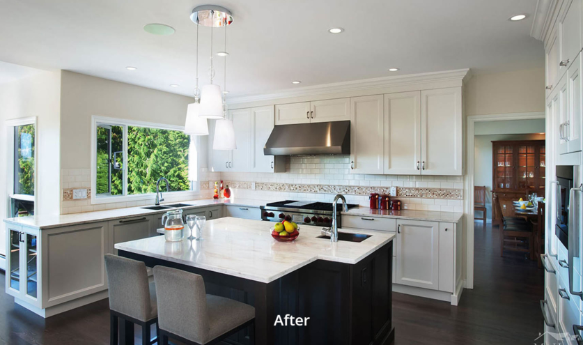 The homeowners also wanted an updated kitchen. New cabinets, white lighting, white walls, and white-insert pot lights to replace the darker choices made in the previous kitchen. See the full project gallery here.