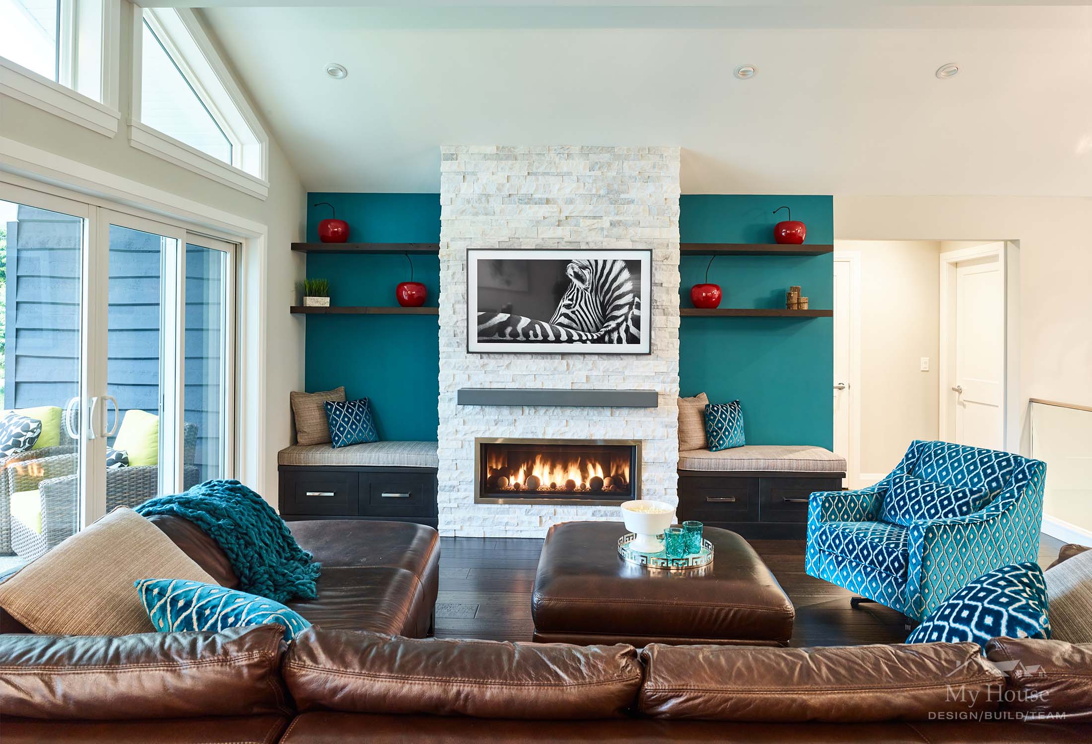 One of the primary objectives of this renovation was to create an amazing kitchen space with lots of function and storage. We have a bright white custom kitchen, with 2 bi-fold appliance garages, double ovens, and a family sized fridge. The island is stained a peppercorn colour and houses an induction cooktop, downdraft vent, 2 spice pullouts, a mixer lift, and of course plenty of wine storage. Top it all off with a 3” mitered edge Camrbia counter top and a turquoise glass mosaic stile splash, and you have a dynamic and interesting space.