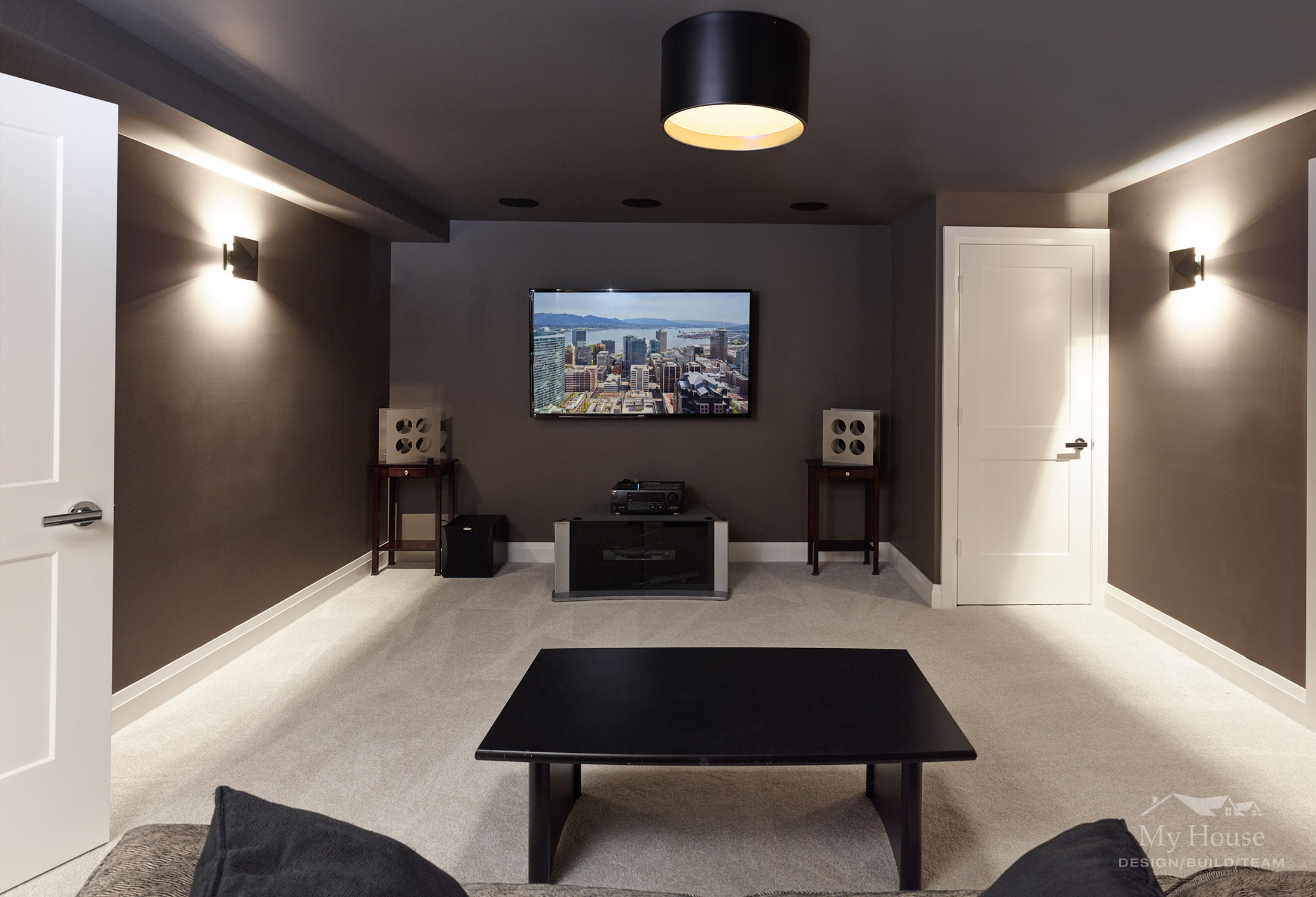 And finally, the basement. A lot of this space was already intact, but we installed new vinyl plank flooring in the rec room and gave everything a fresh coat of paint. We took one of the rooms and created a home theatre for him.