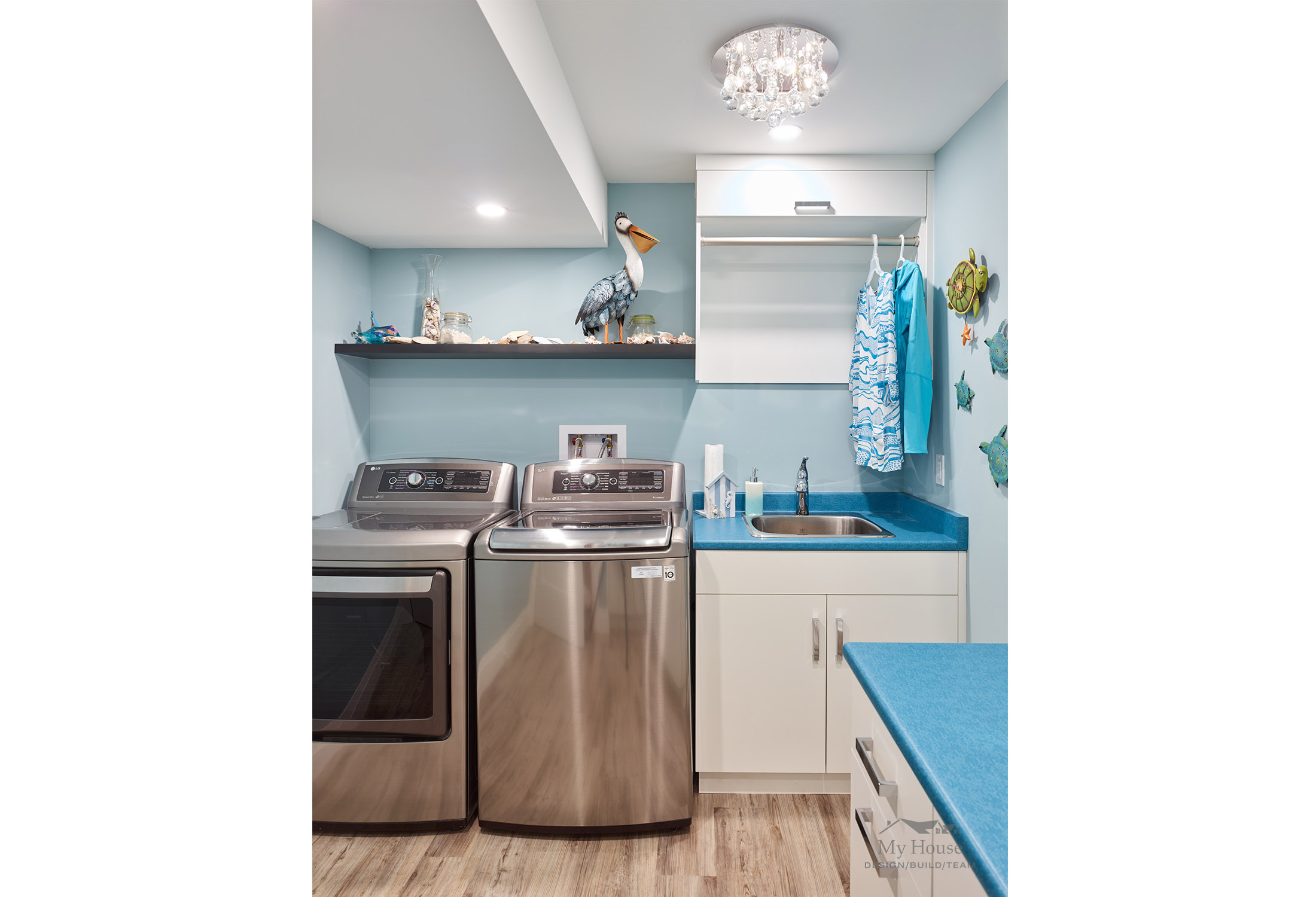 We also re-vamped and brightened up the laundry room for her, complete with a crystal chandelier and laundry chute from the linen cabinetry upstairs. As she said, “If I’m going to spend half of my life doing laundry, I at least want to enjoy it”, and we couldn’t agree more.