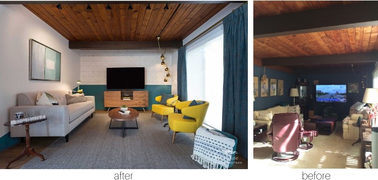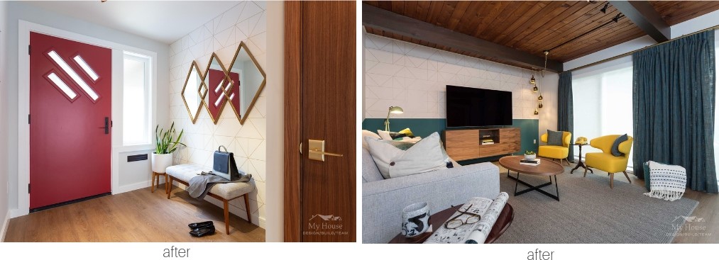 Additional details like the geometric wall paper in the foyer, the vintage light fixture in the living room, and the bold drapery help to tie everything together to create a cohesive mid-century modern feel throughout the entire home.