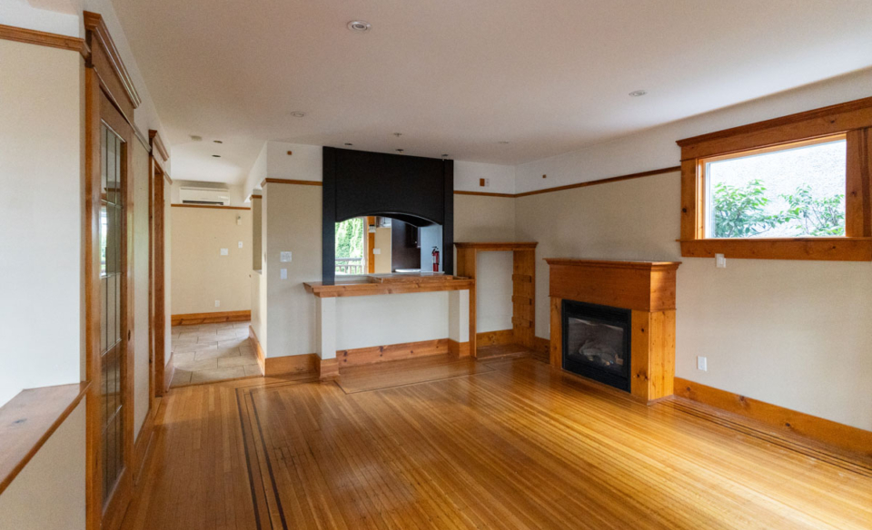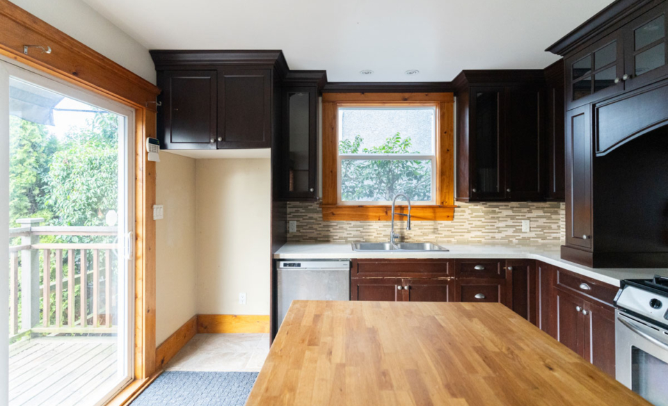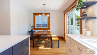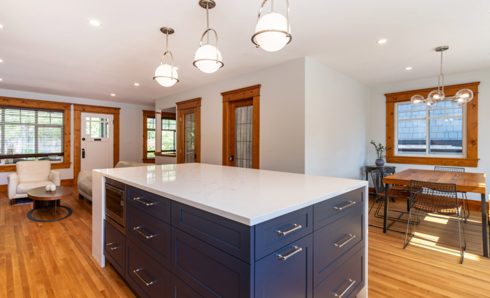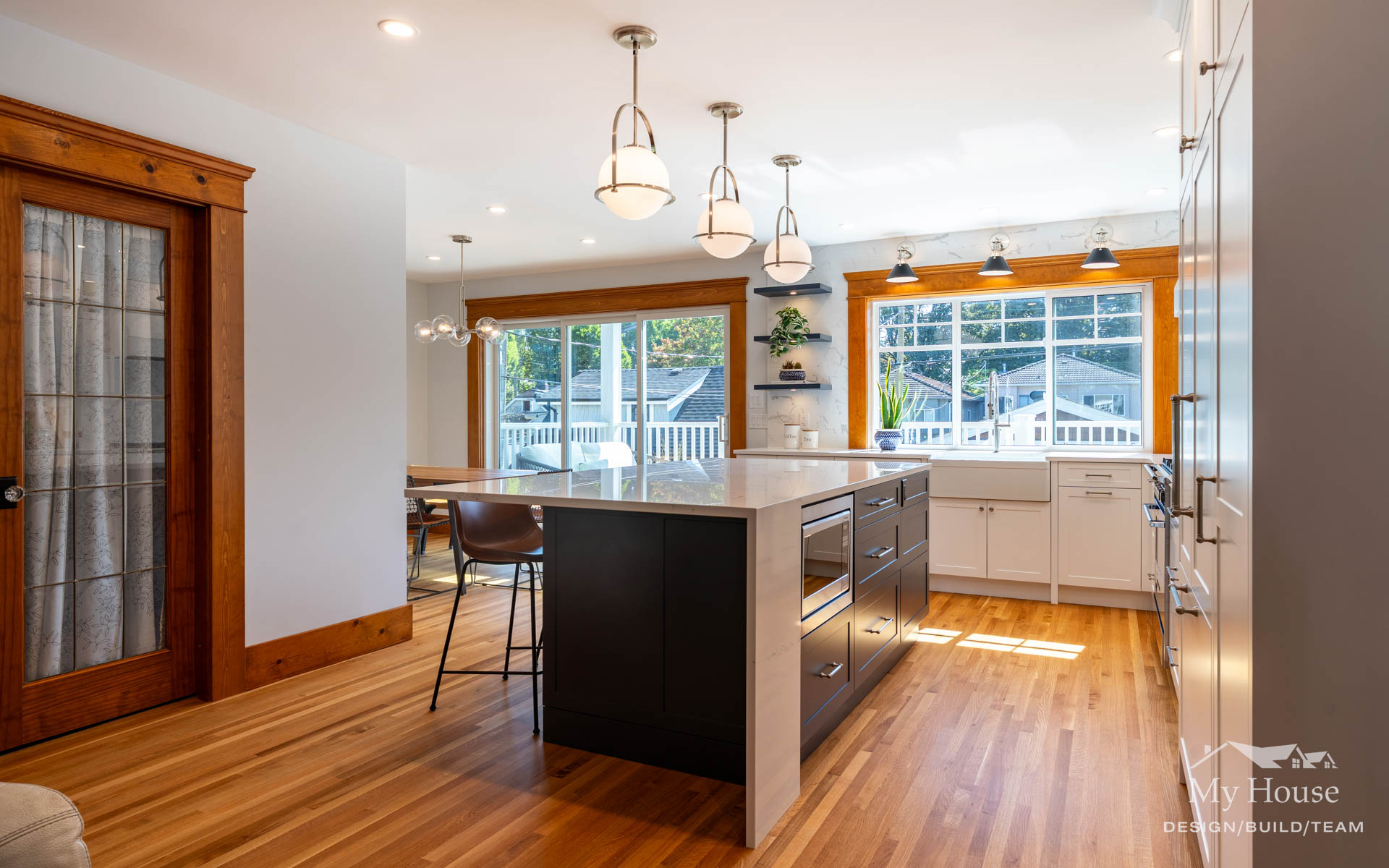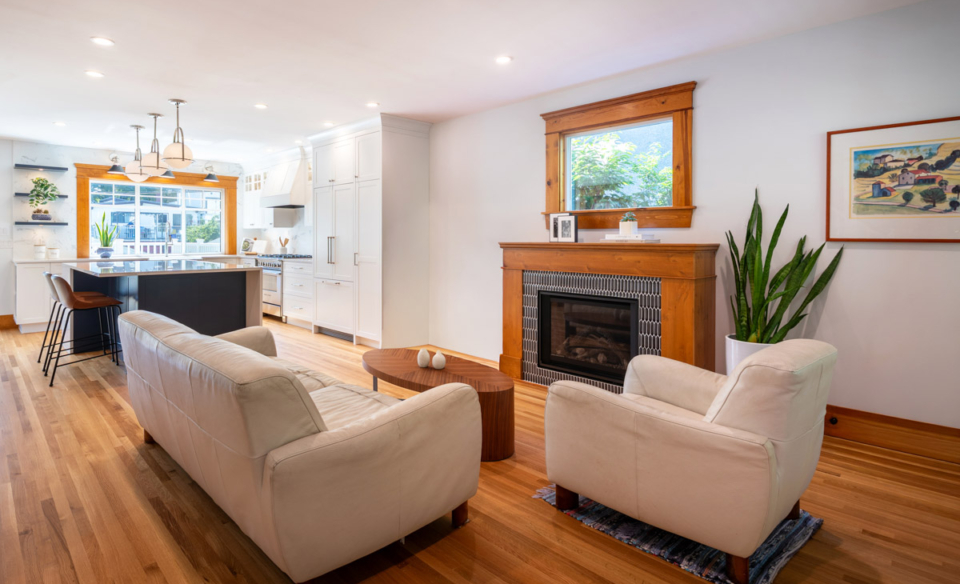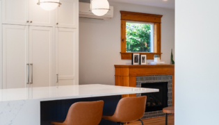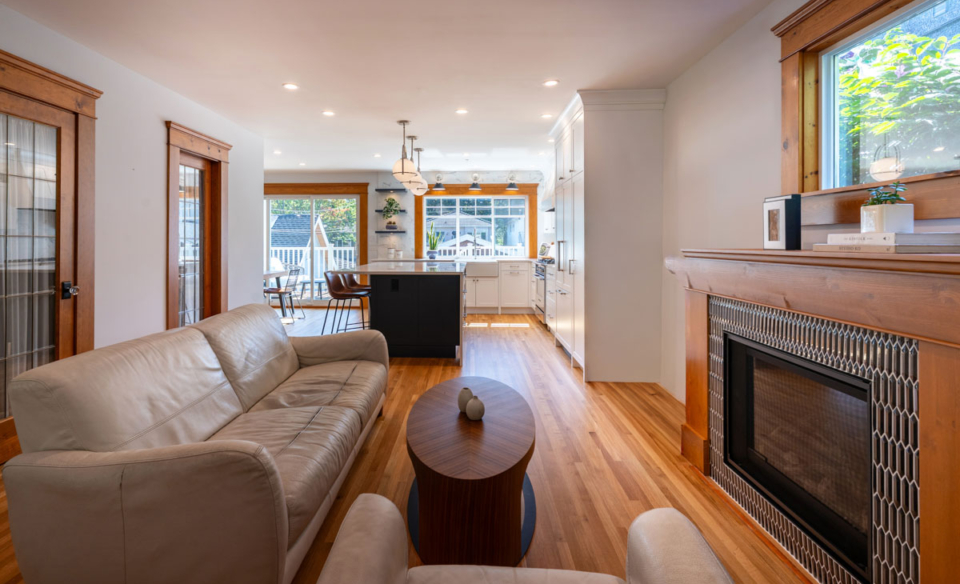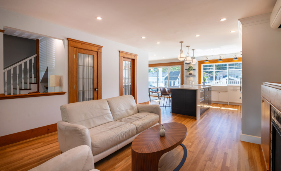 This Vancouver character home underwent a main floor transformation to improve flow and modern functionality while respecting its original charm. The enclosed kitchen was opened up with a large L-shaped layout and central island with seating, perfect for family living and entertaining. The main floor bathroom received a cosmetic refresh, and the yard was re-landscaped to connect seamlessly with a new partially covered deck, creating a safe and enjoyable outdoor space for children.