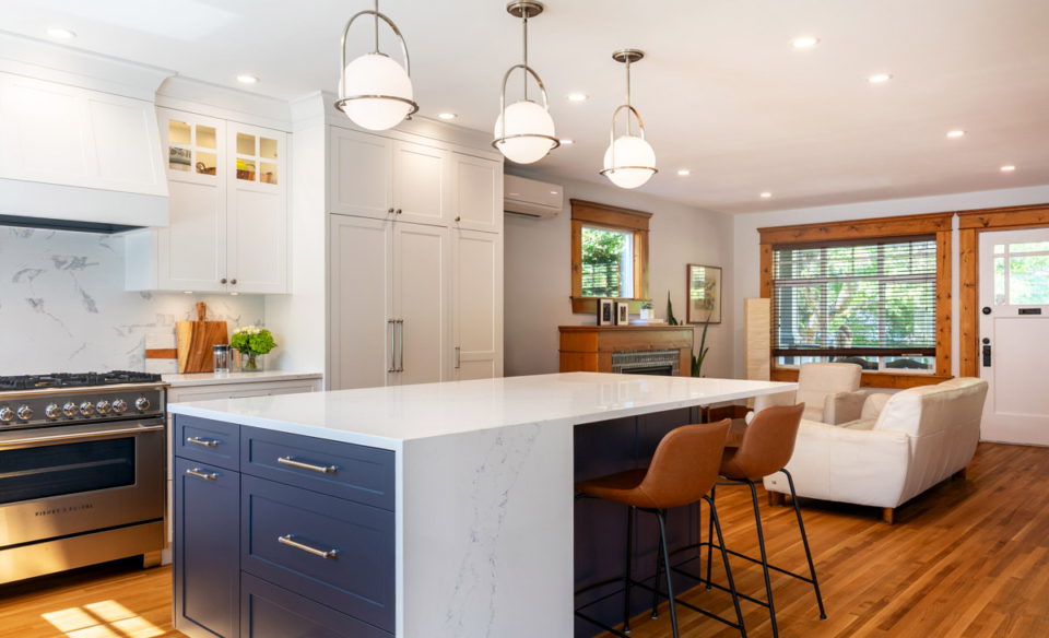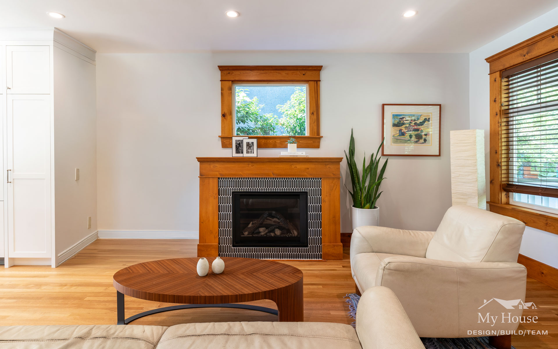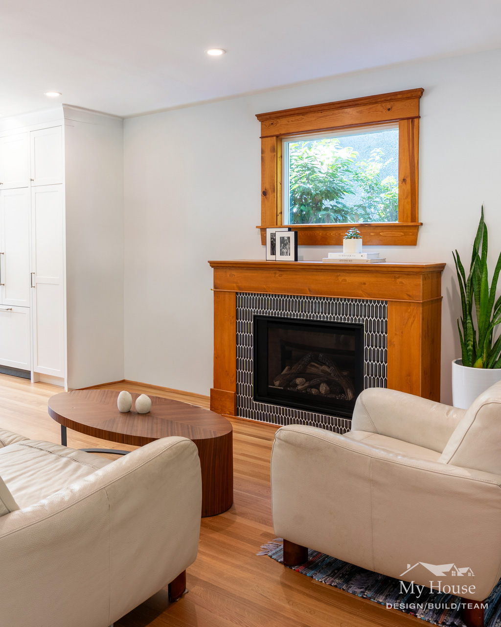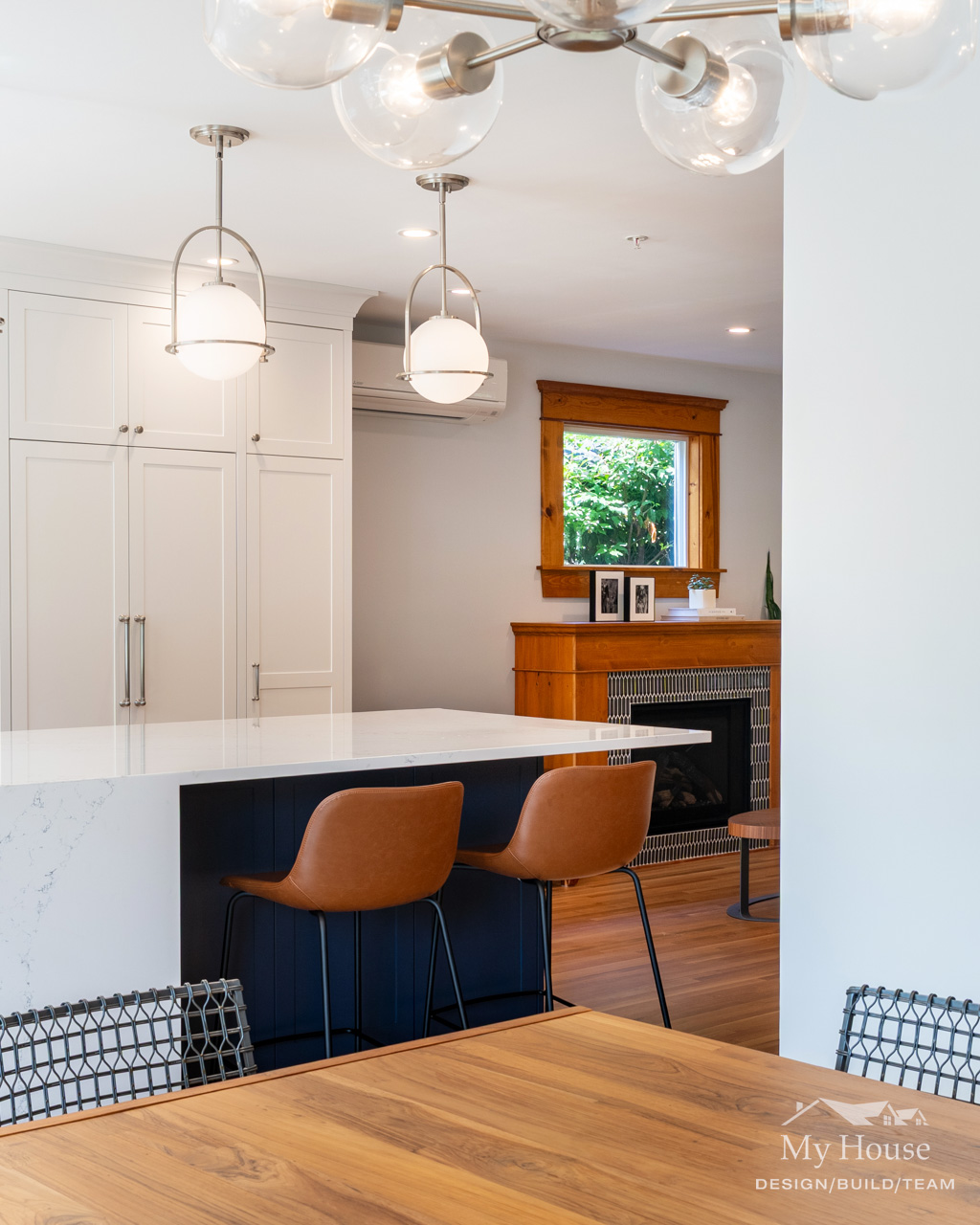 Original knotty pine mouldings were preserved, and vintage oak floors were replaced with closely matched alternatives. Modern and traditional design elements were blended throughout, including a custom fireplace with wood surround and tile face, Canadian quartz countertops, a fireclay farmhouse sink, and a striking blue kitchen island.