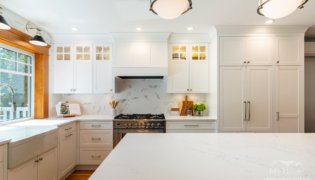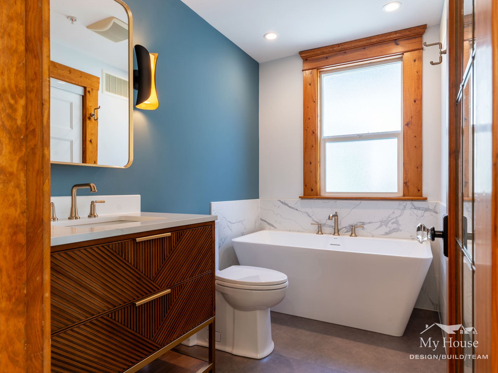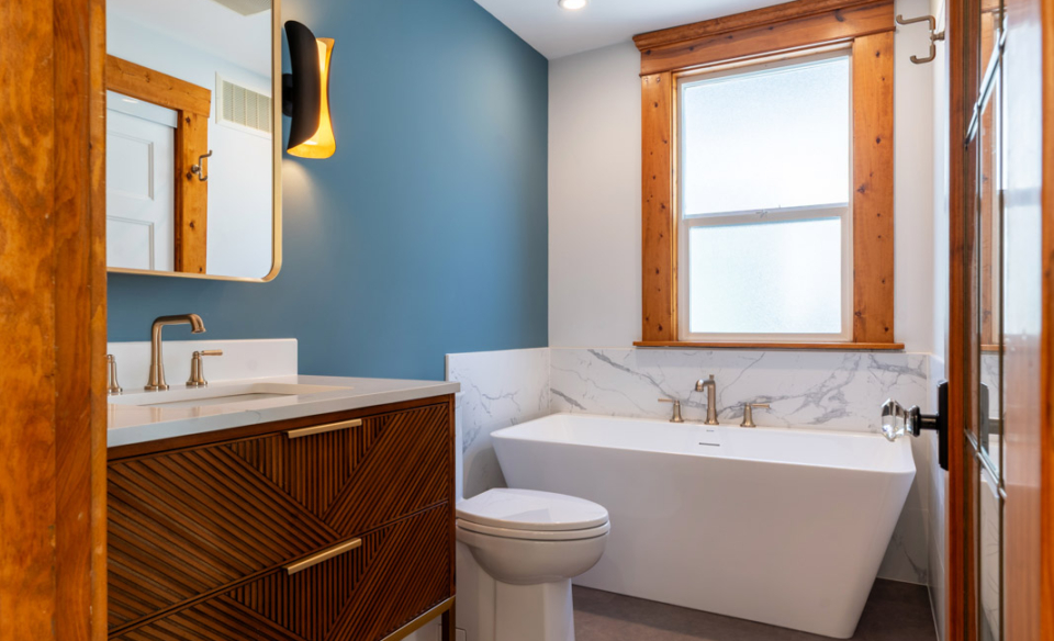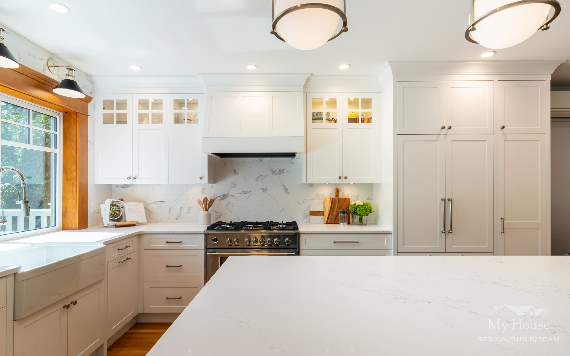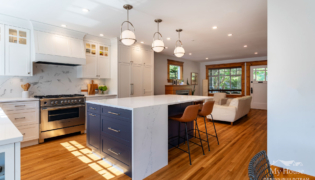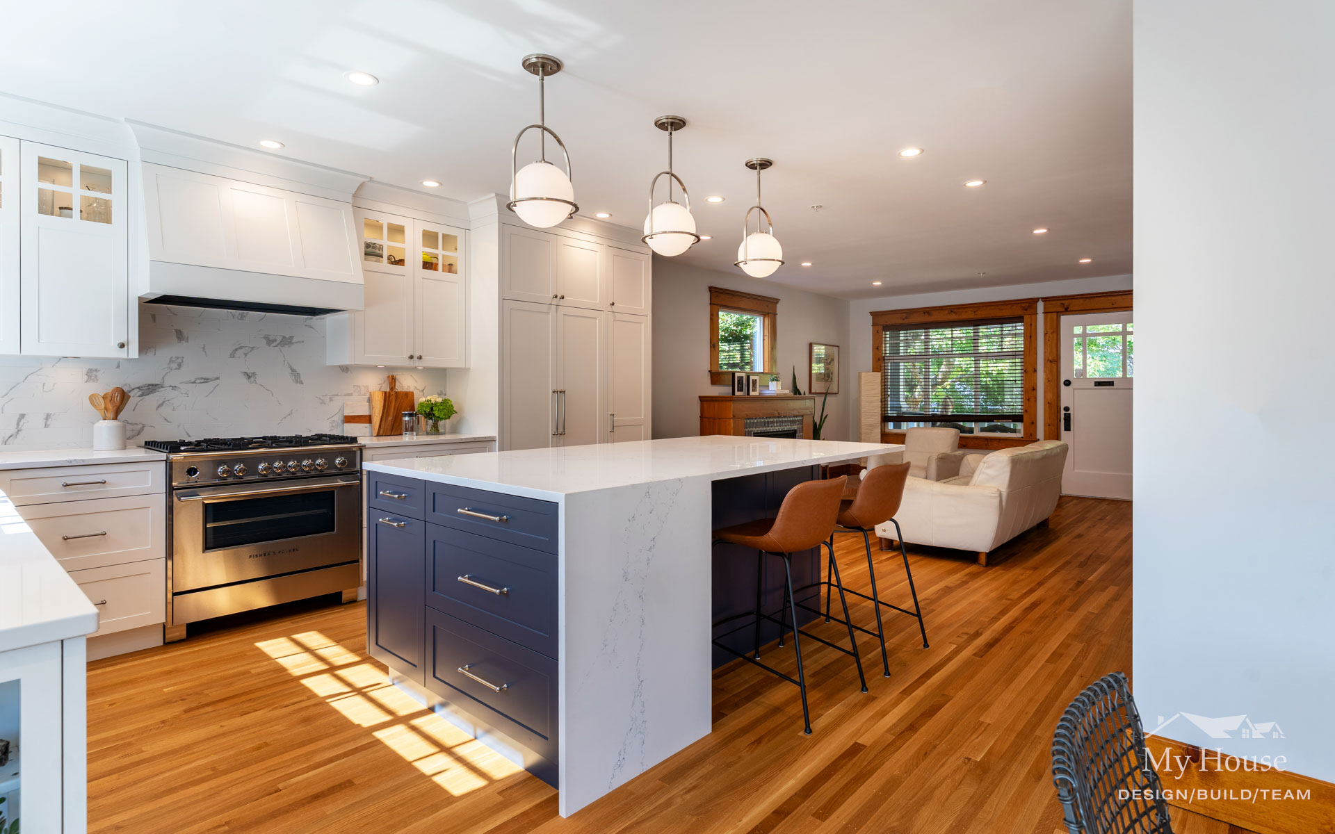 Original knotty pine mouldings were preserved, and vintage oak floors were replaced with closely matched alternatives. Modern and traditional design elements were blended throughout, including a custom fireplace with wood surround and tile face, Canadian quartz countertops, a fireclay farmhouse sink, and a striking blue kitchen island.