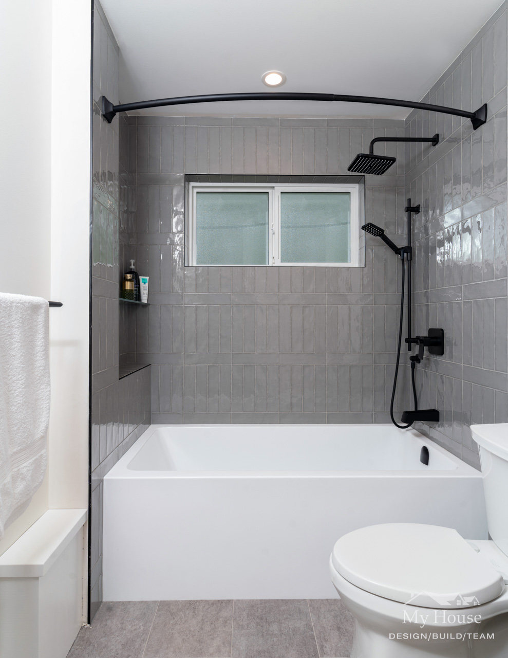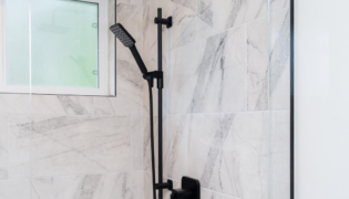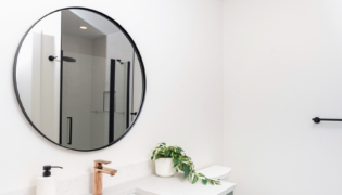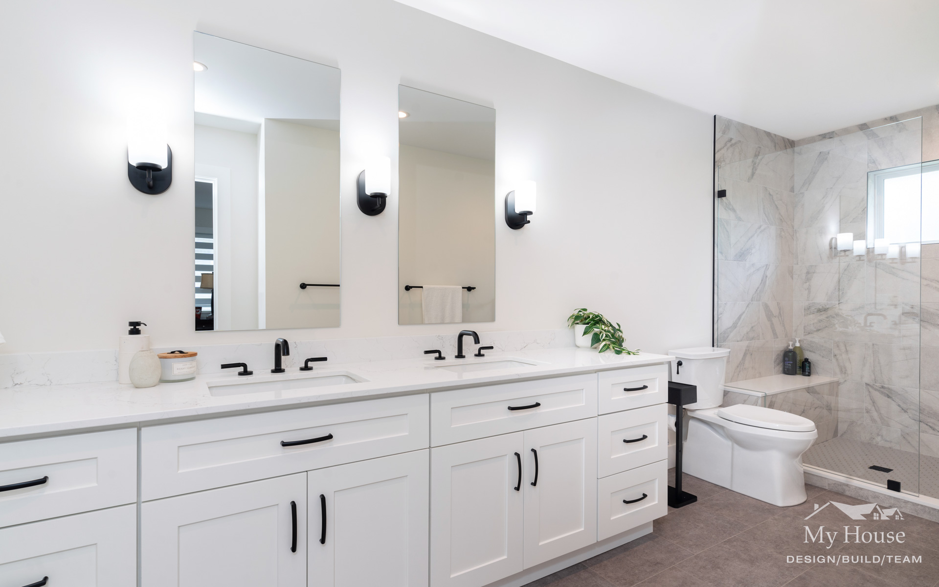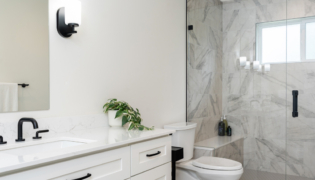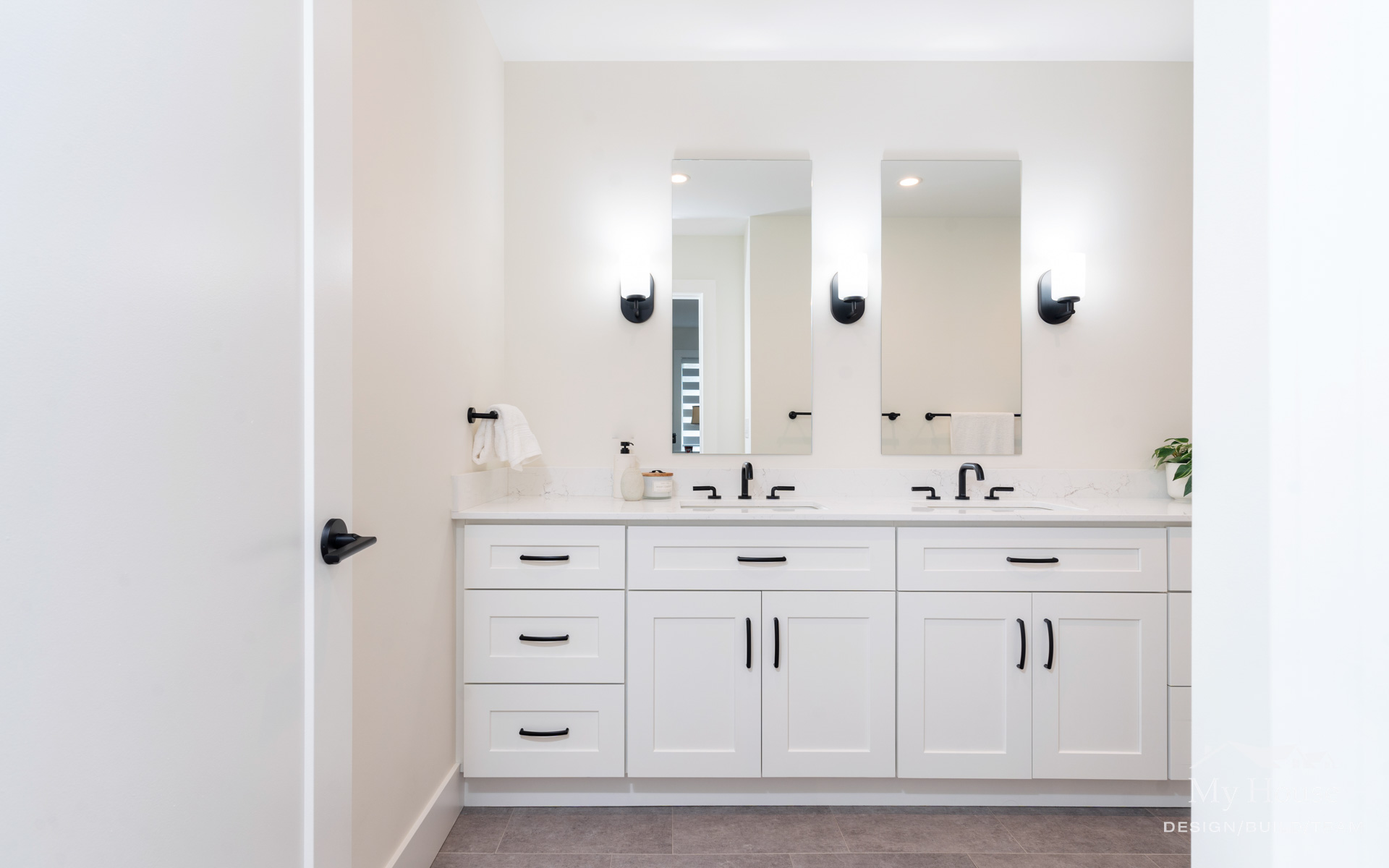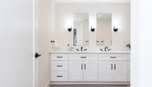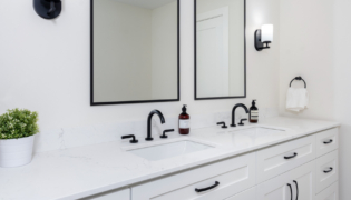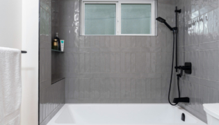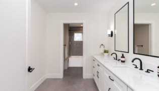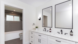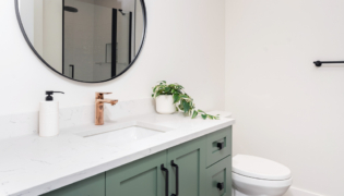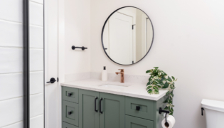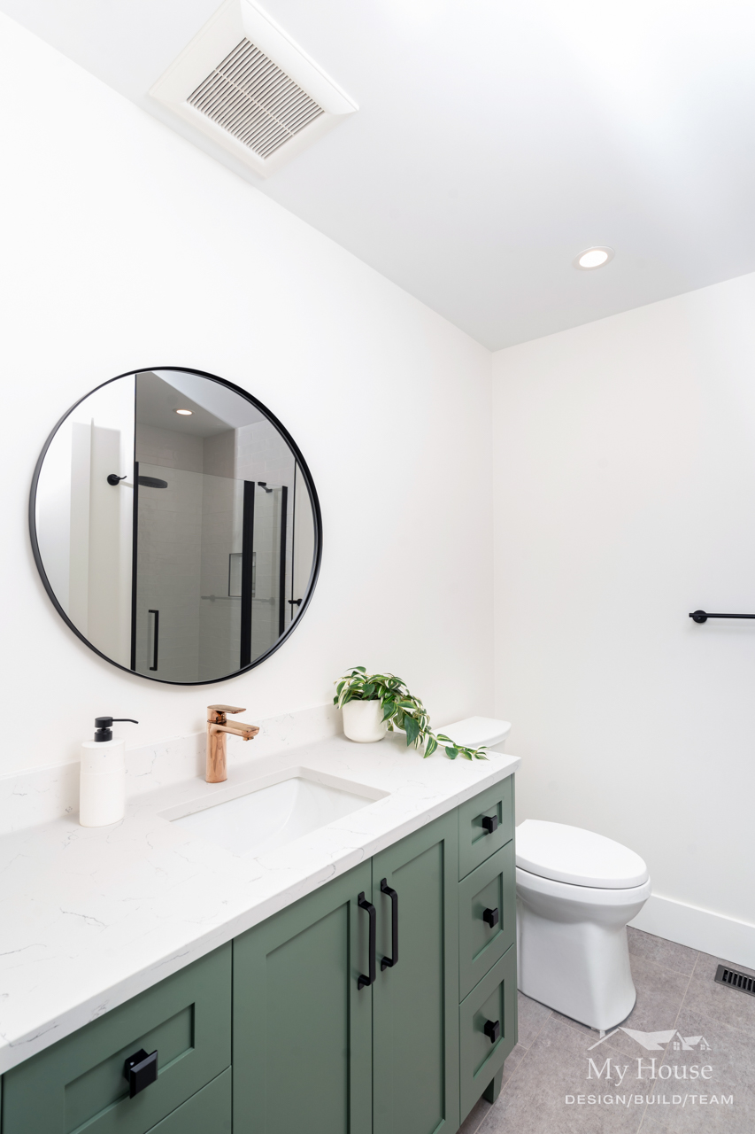 Both bathrooms were completely overhauled from their dated vinyl flooring and lackluster cabinetry to fresh, modern designs. The main bathroom is now a sleek white space with bold black accents and stylish grey flooring, creating a spa-like atmosphere. The powder room adds a pop of color with a rich green vanity, bringing personality and warmth to this small but impactful space.