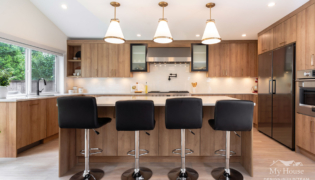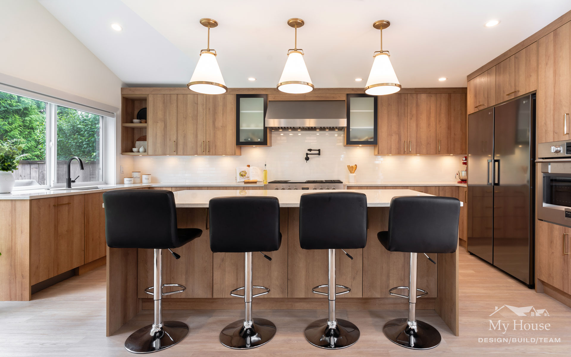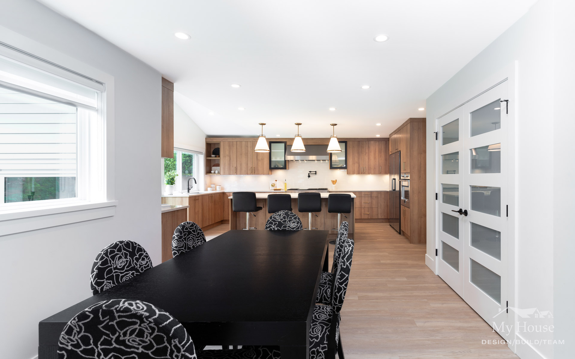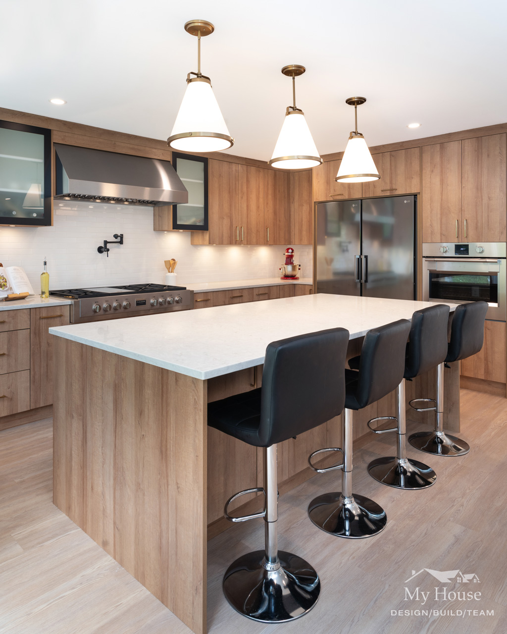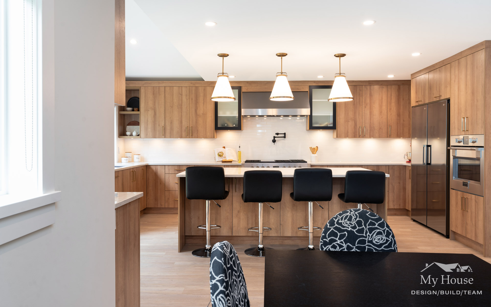 The kitchen now features medium wood grain cabinetry with sleek matte black accents and brushed gold hardware, adding a touch of warmth and sophistication. A large, expansive island serves as the focal point, providing ample prep space and seating for the family. Crisp white countertops and three statement pendants over the island enhance the space’s clean, modern feel. We added a window above the sink for extra light and squared off the space where a fireplace once stood, creating a more functional layout that seamlessly connects to the dining and living rooms.