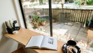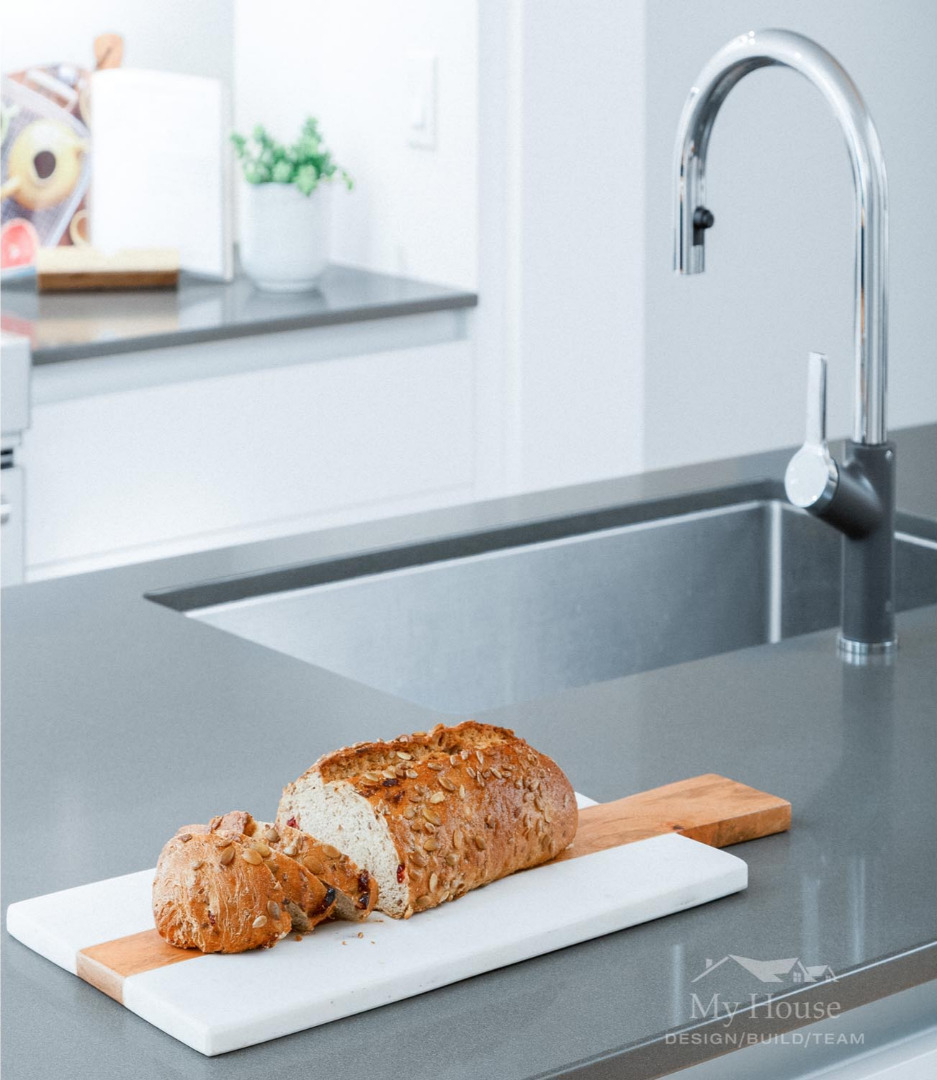 The kitchen cabinets were replaced with flat panel, square-edge cabinets and the uppers lift-open. To create an elegant minimalist feel, the full height quartz back splash looks almost like concrete. We also removed the kitchen nook and replaced it with a live-edge counter top, making it a haven to enjoy a morning cup of coffee.