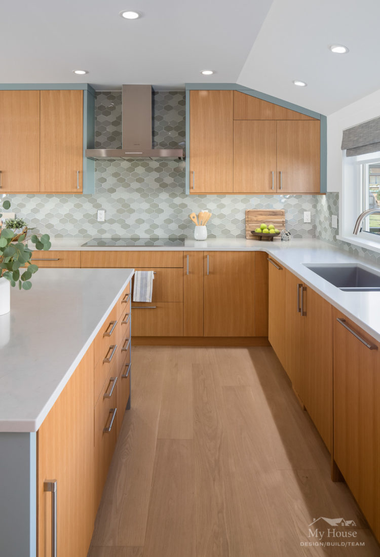 The cramped kitchen became L-shaped, with a better working triangle, and more storage and counterspace. New flat panel cabinets in vertical grain white oak replaced old. Parts of the kitchen island and cabinet trim were painted a classic Piedmont Gray. A subtle grey hexagonal-shaped mosaic backsplash juxtaposes the vertical lines in the cabinets. Caesarstone quartz countertop with square edges completes the look.