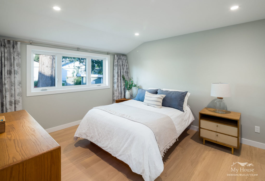 The small outdated bathroom with an under-utilized tub became a modern space with a generous sized walk-in shower and vanity with two sinks. Floating cabinetry and a wall hung toilet gives the illusion of more space. To find out how the My House Design/Build/Team can help with your Burnaby kitchen renovation, contact us through our free consultation form. Our team can help bring your renovation dreams to reality.