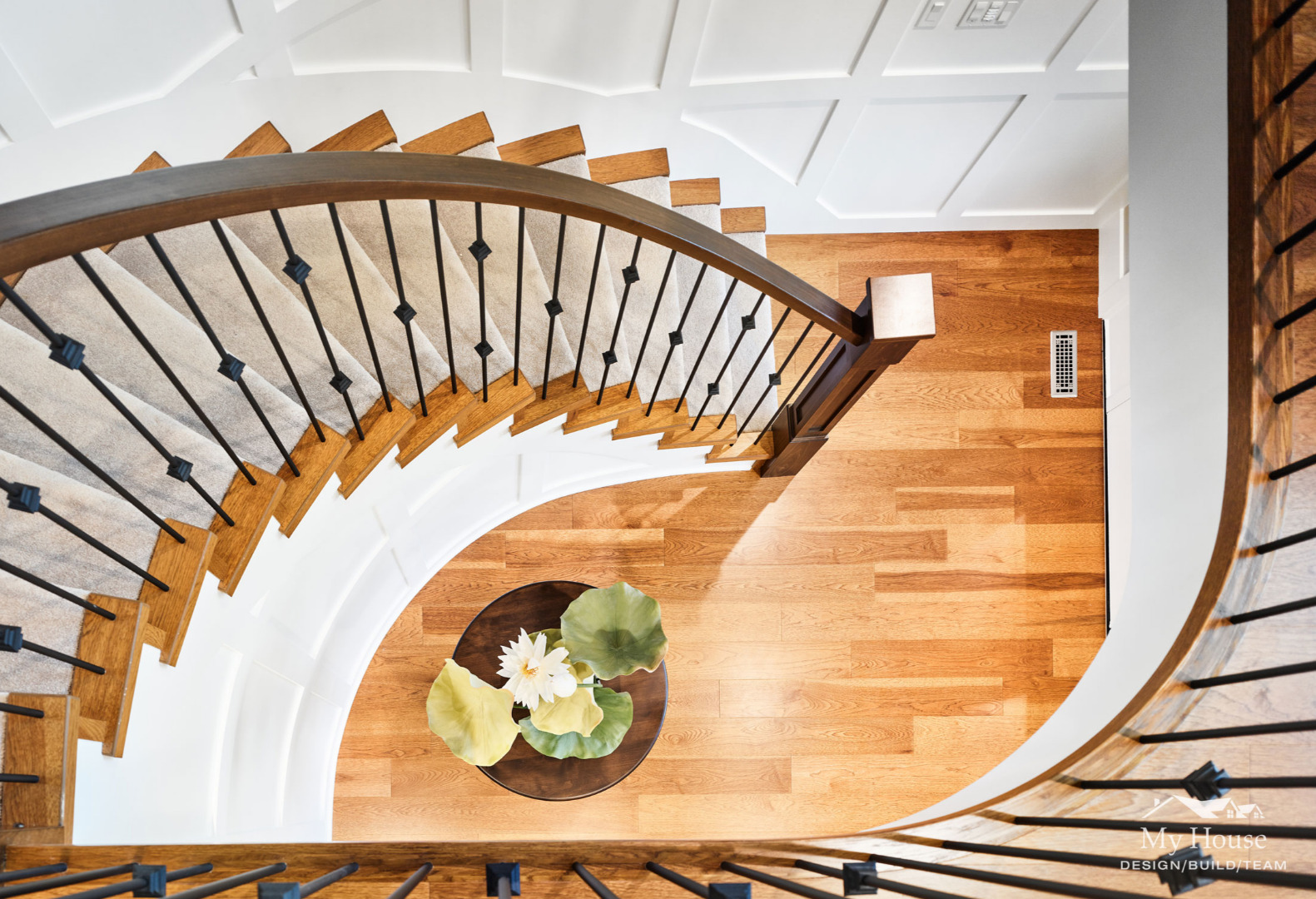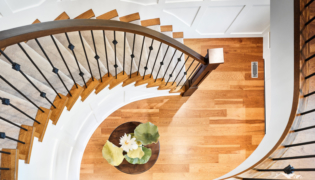 While most of the home now has warm hardwood flooring, we added carpet to the stairs so the family’s older dog could easily get up and down.