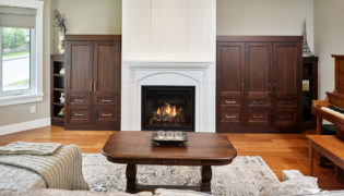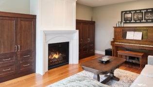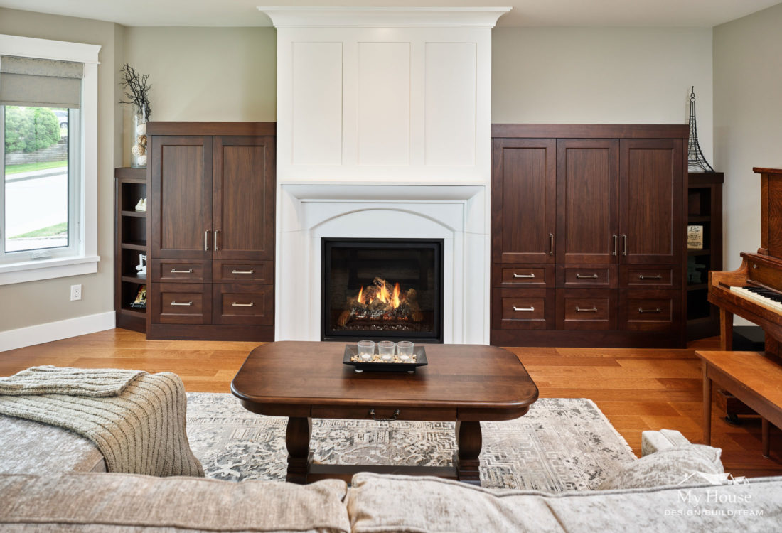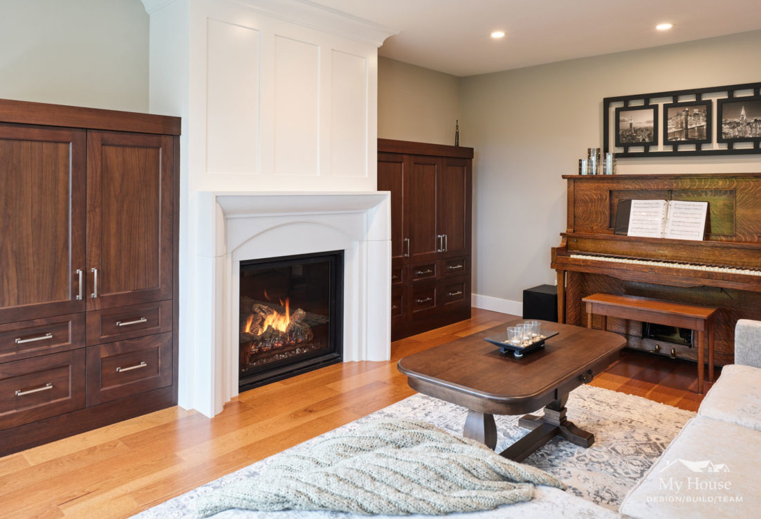 To add warmth in the new great room, we added a custom fir feature wall that creates an interesting focal point for the room.