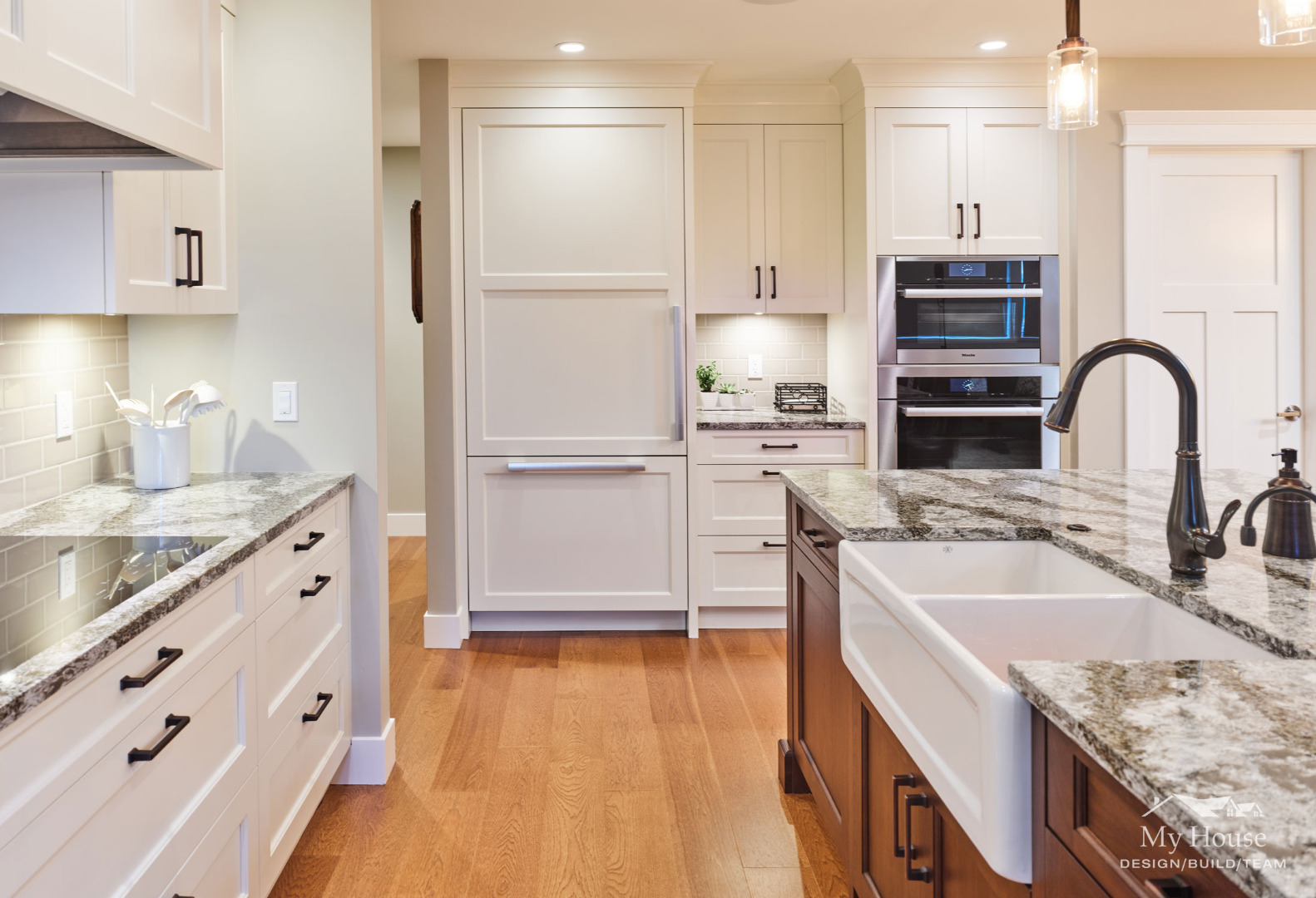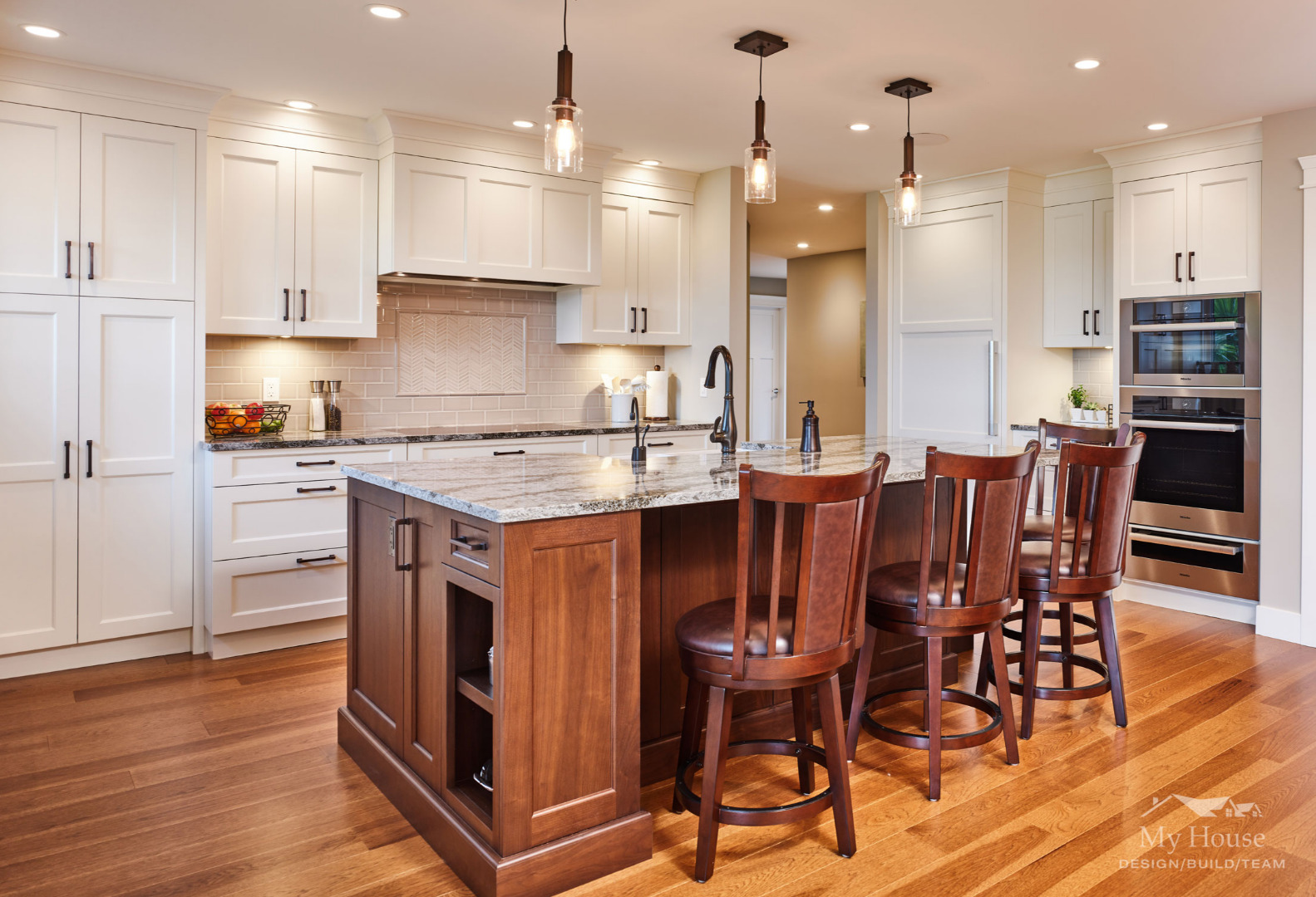 We installed a new steam oven in the kitchen so the family can cook healthier meals together. Their new induction cooktop will save on energy bills because it only heats a space equal to the pot size used.