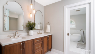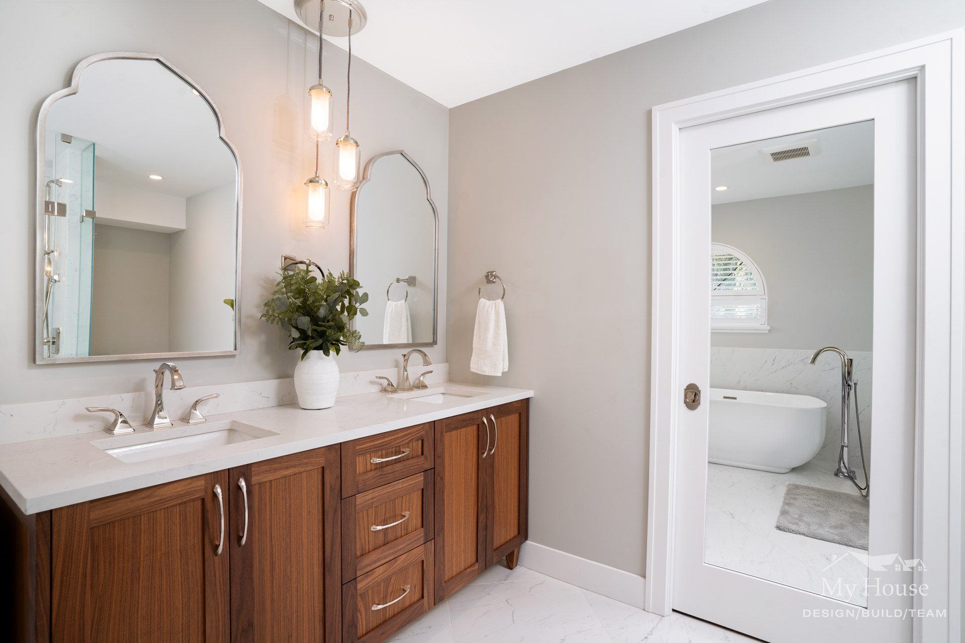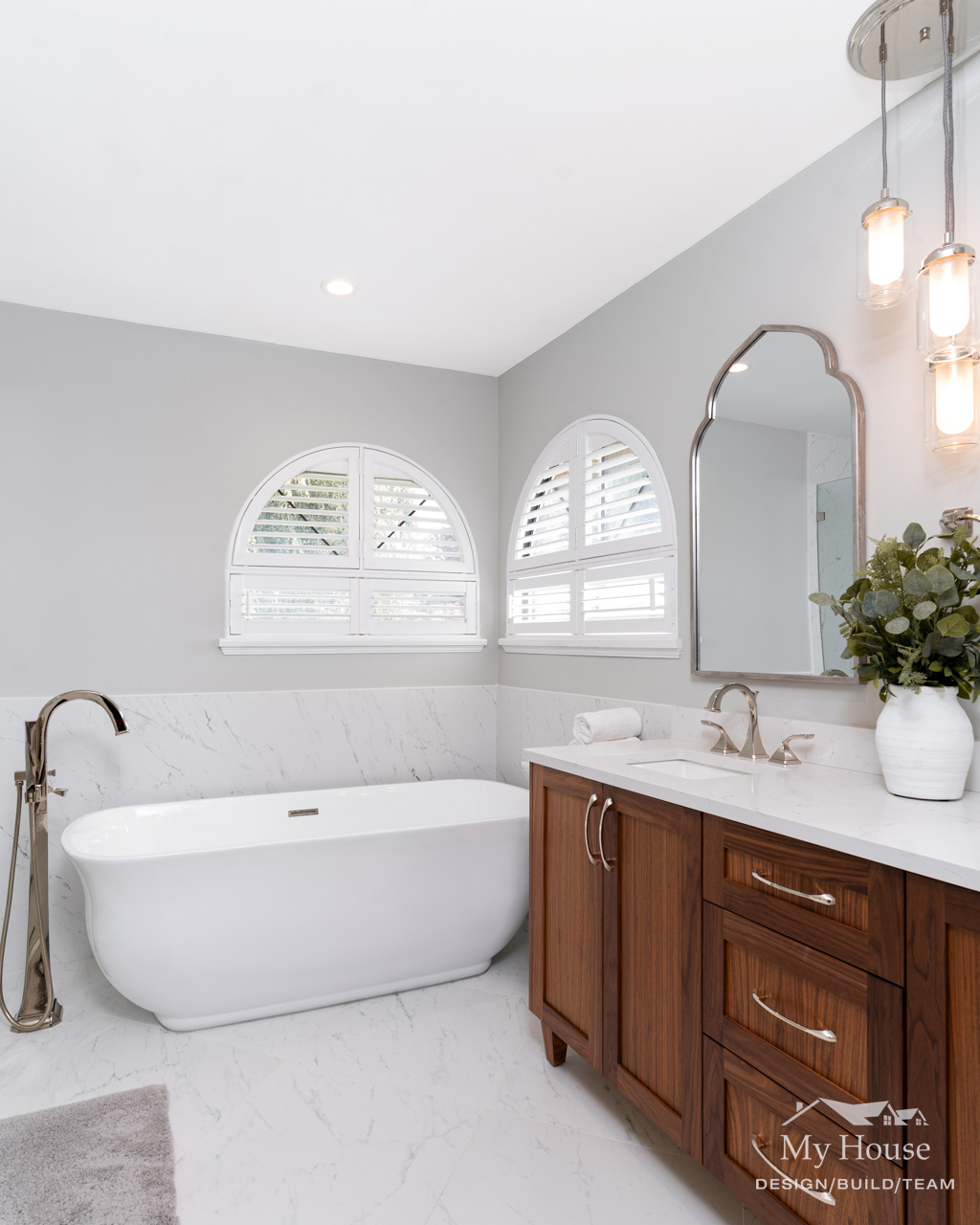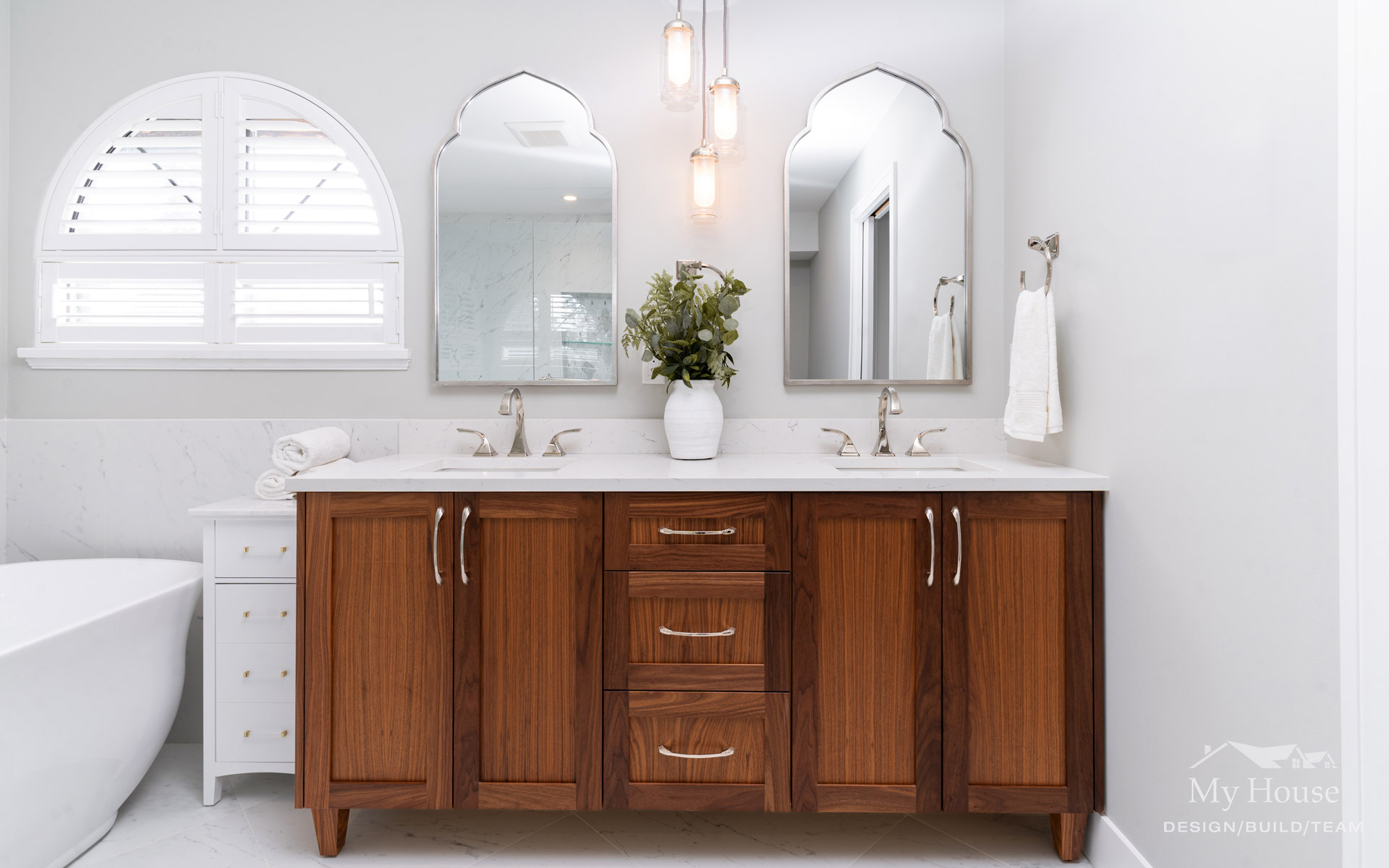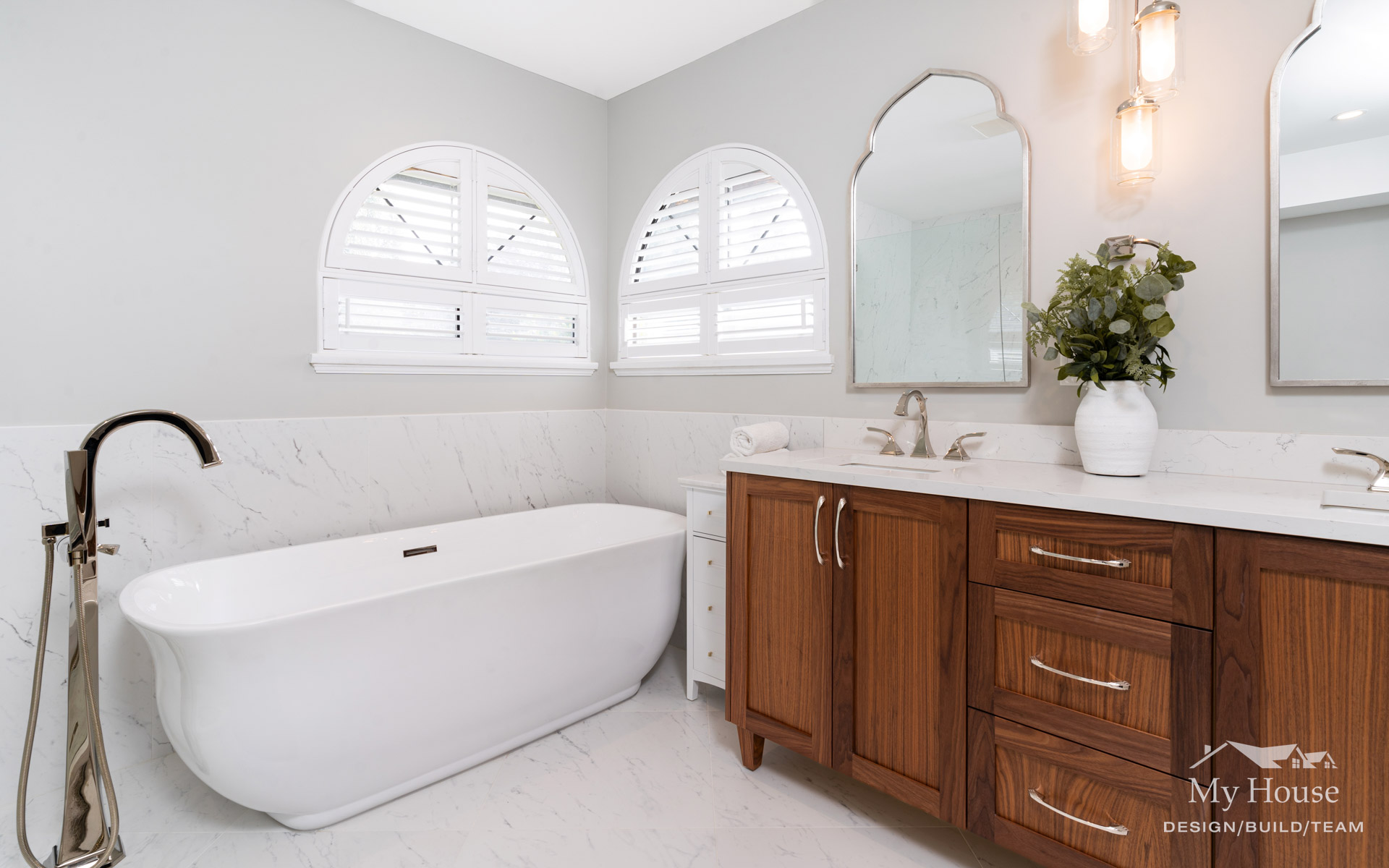 By playing off the room’s natural curves and adding sophisticated finishes, we created a timeless, spa-like escape that feels both luxurious and inviting.