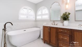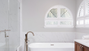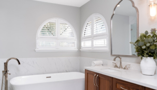 The entire design was inspired by the stunning curved windows that naturally frame the space. To complement this unique feature, we chose a new bathtub with a softly curved base that echoes the windows’ shape. Marble tile now anchors the room, adding a touch of luxury, while a curved mirror ties the design elements together beautifully.