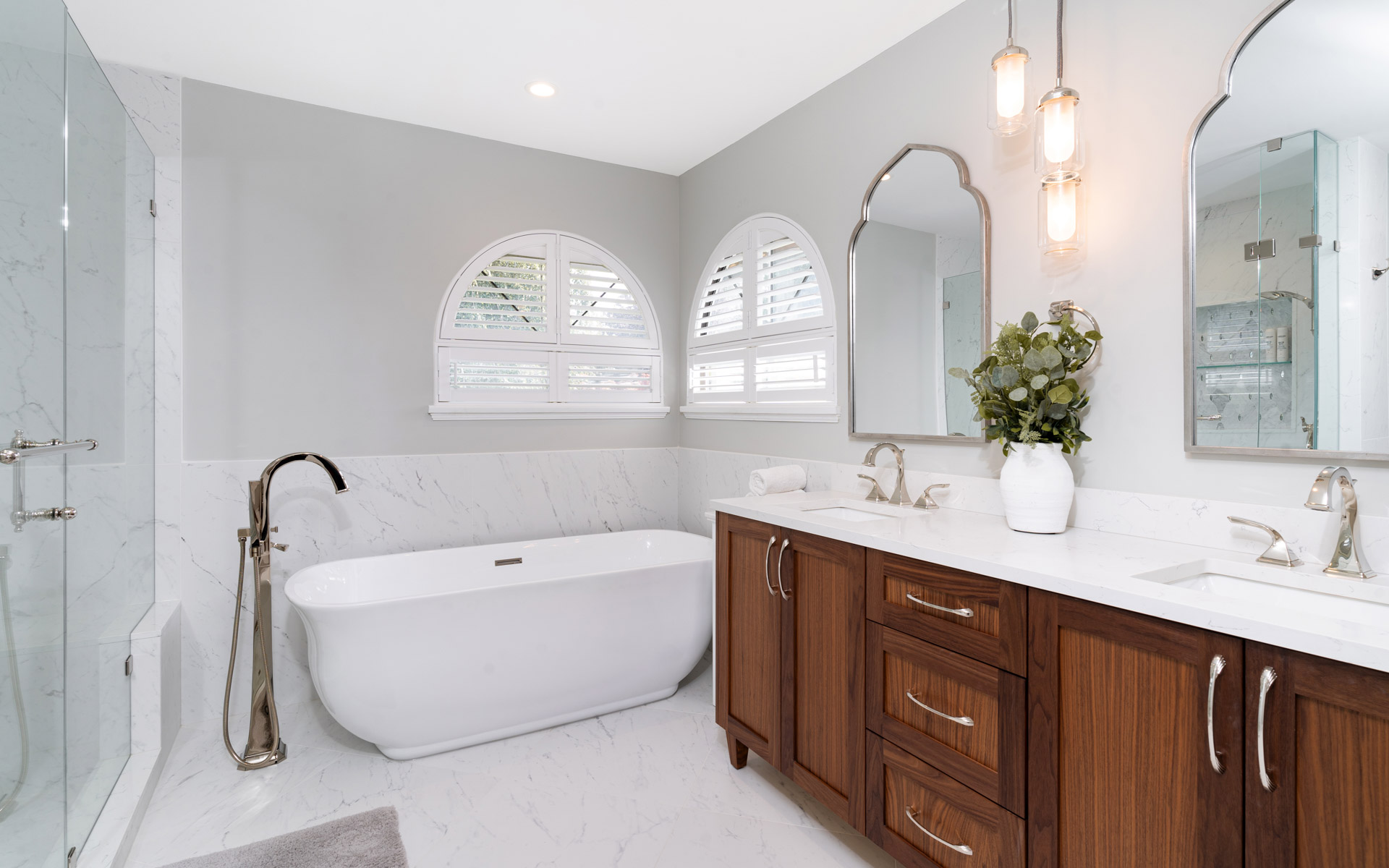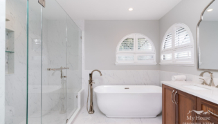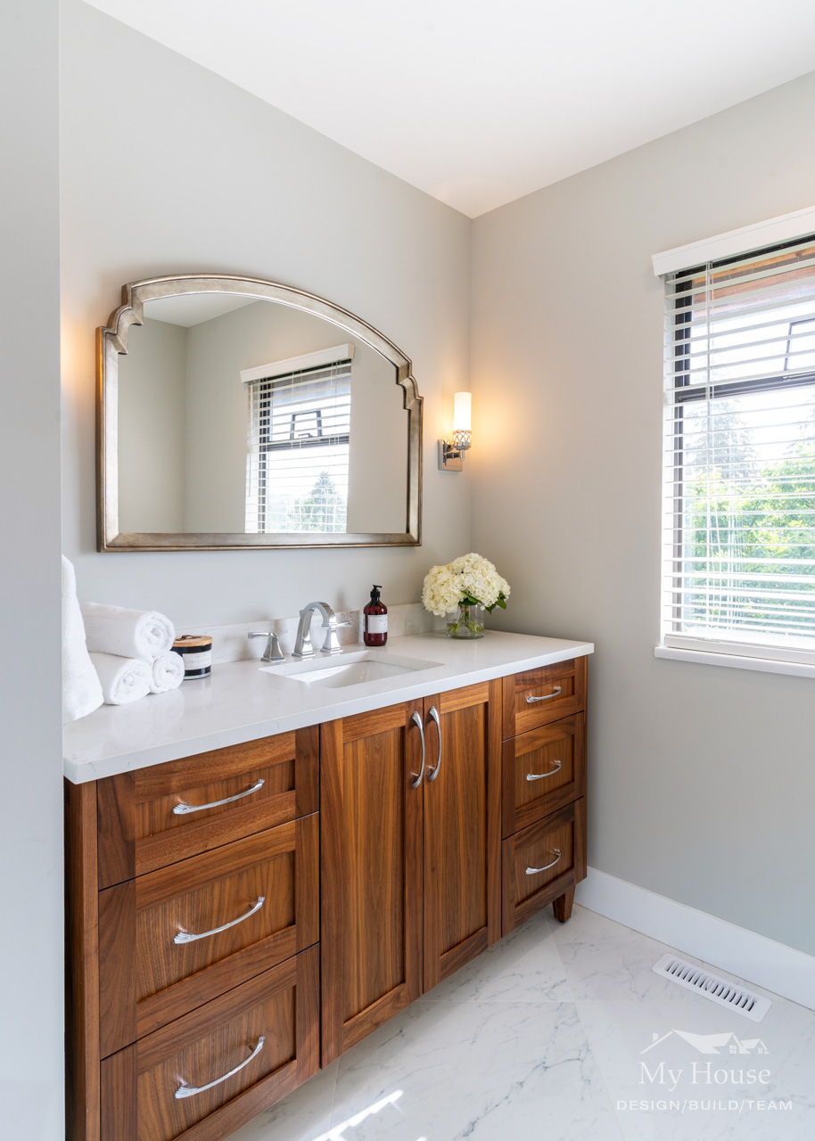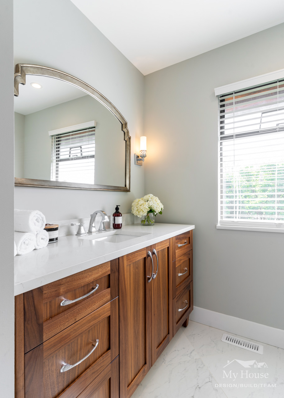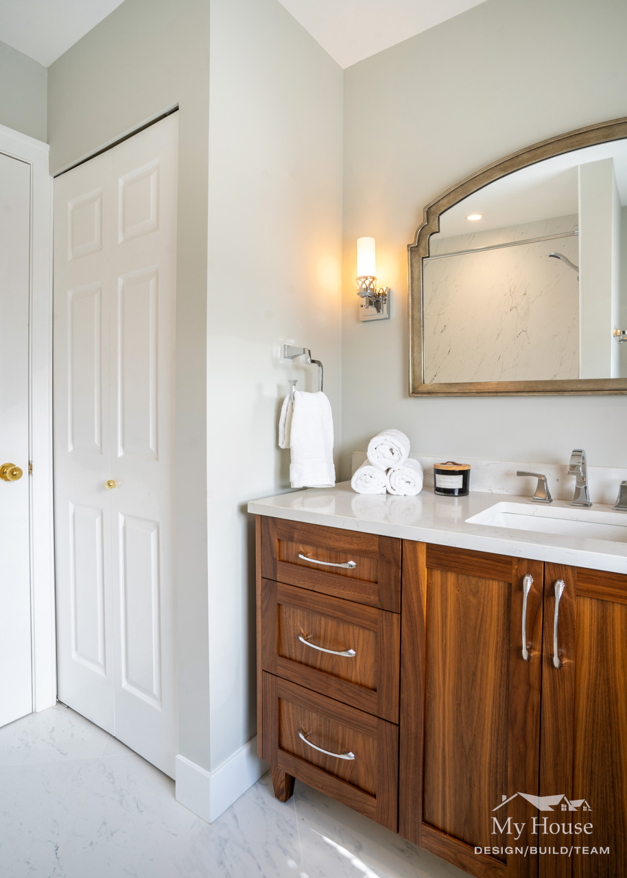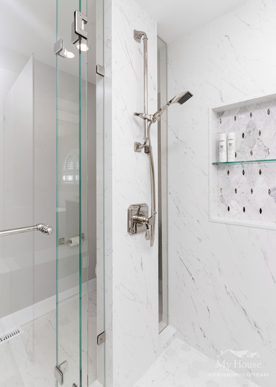 The double vanity brings a classic touch with its elegant wood base and marble countertop. The shower has been expanded into a spacious, marble-lined oasis with a built-in bench and a convenient nook for product storage.