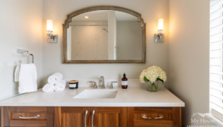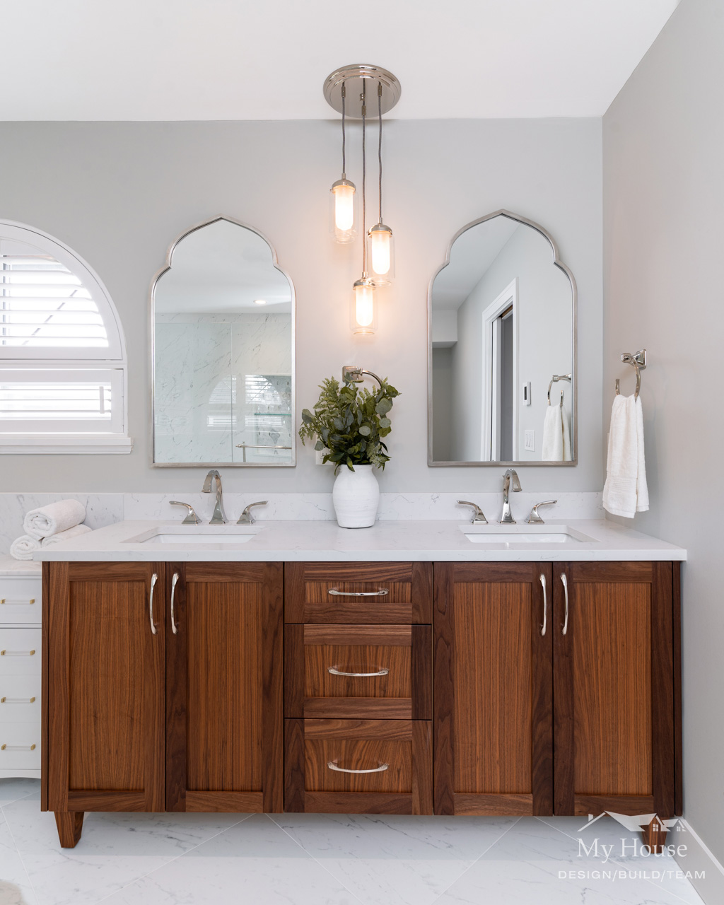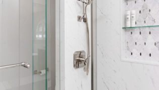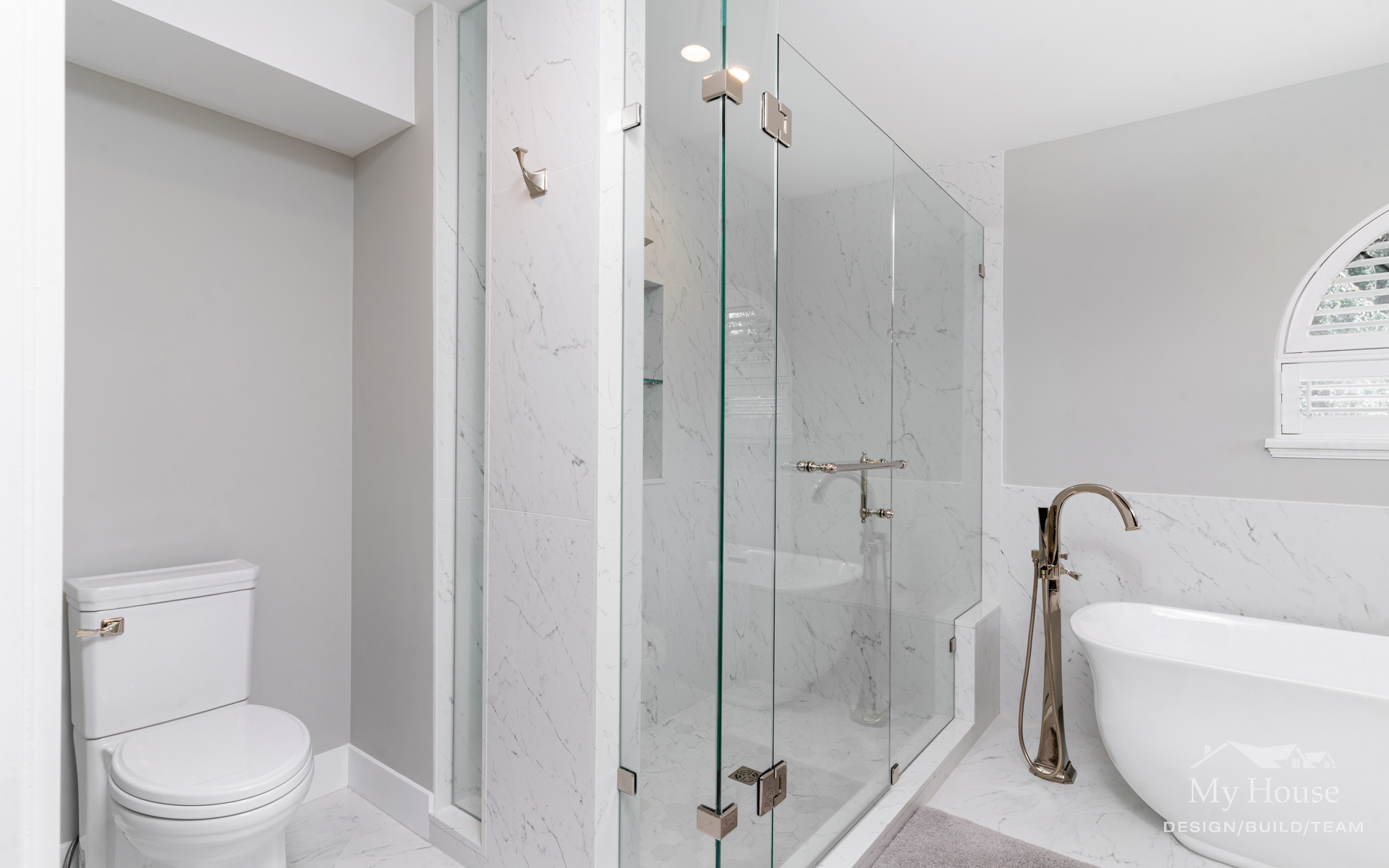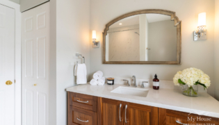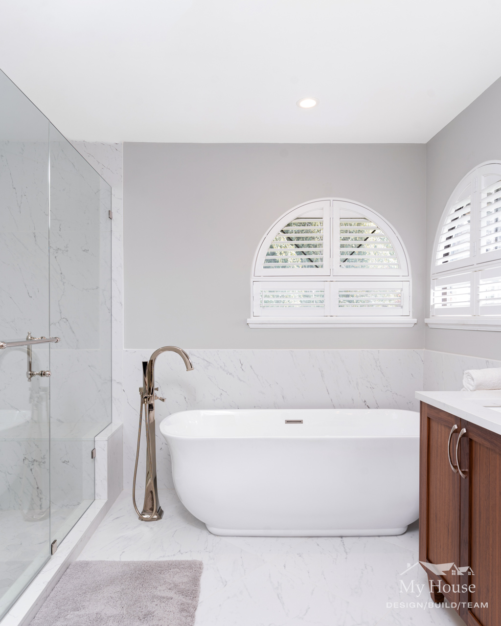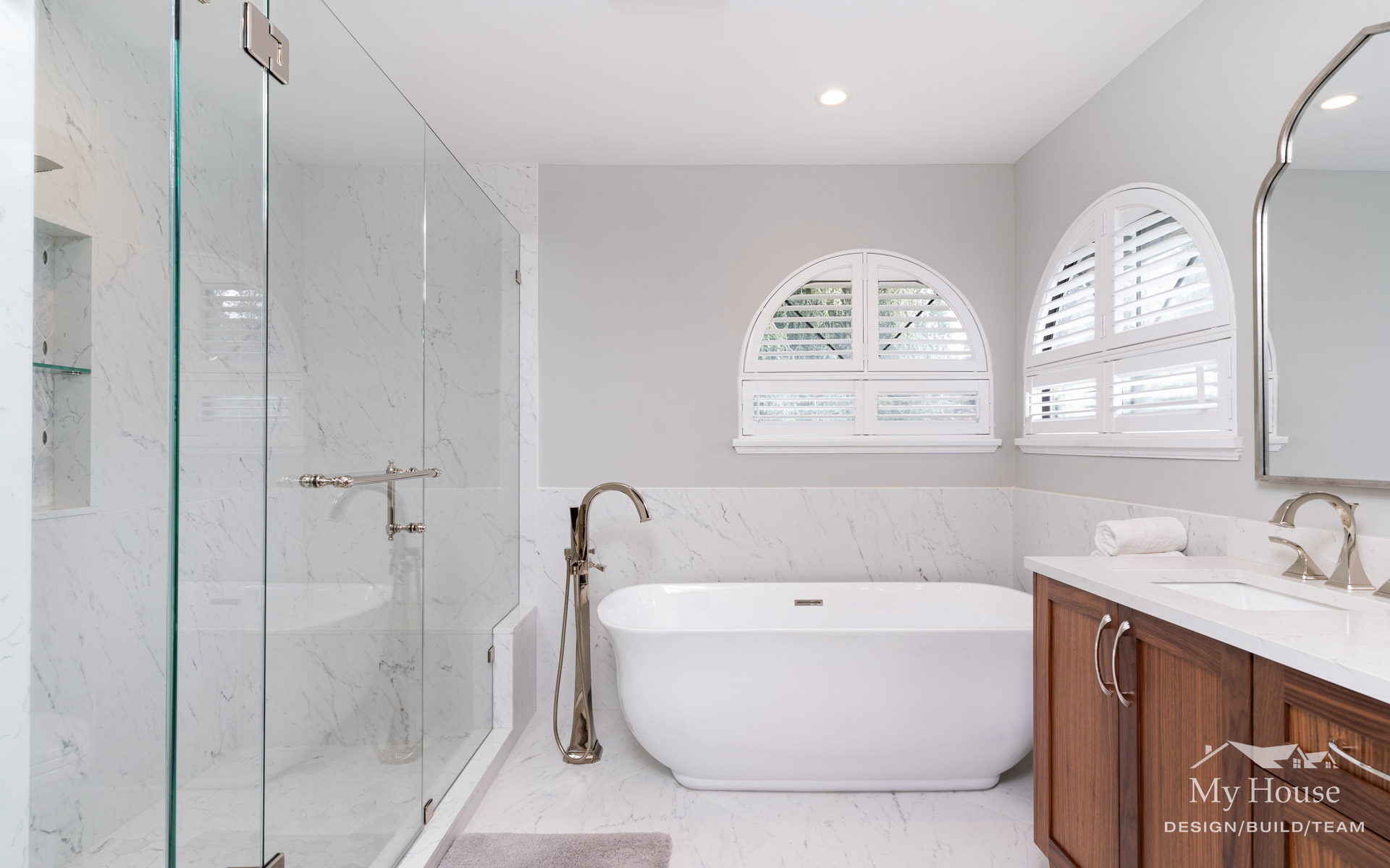 The double vanity brings a classic touch with its elegant wood base and marble countertop. The shower has been expanded into a spacious, marble-lined oasis with a built-in bench and a convenient nook for product storage.
