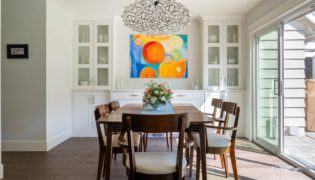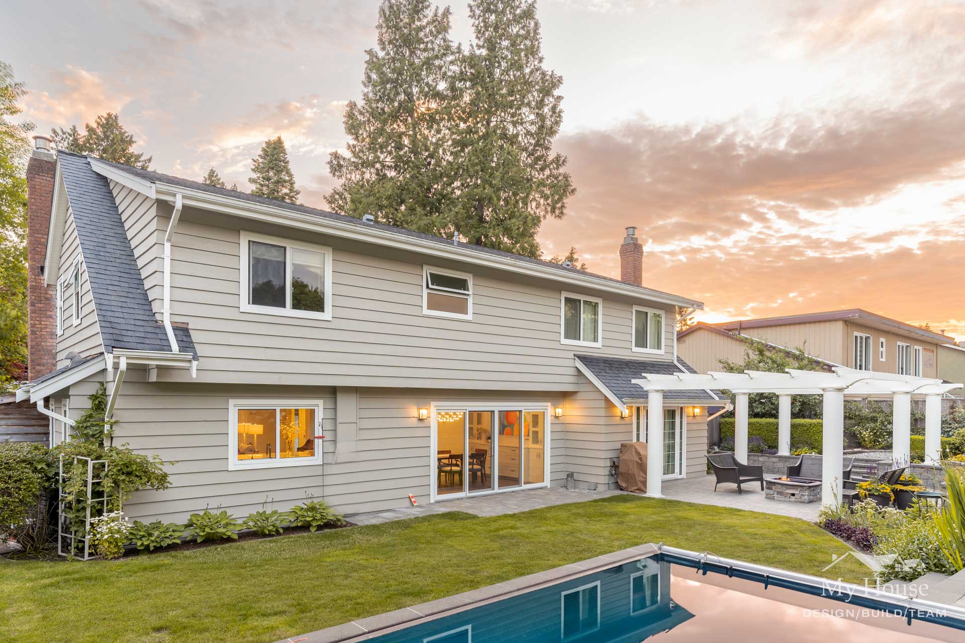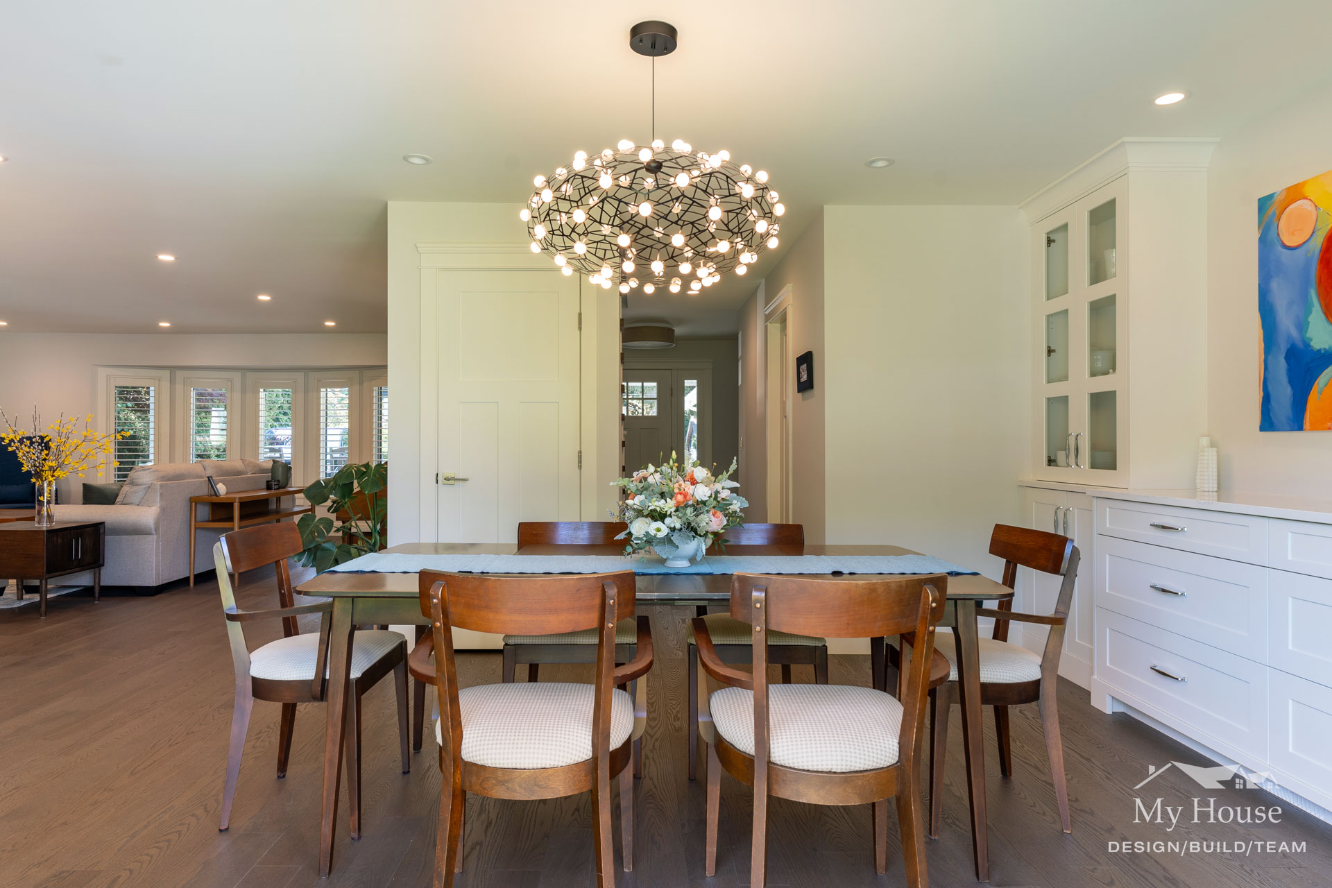At the heart of this renovation lies the stunning kitchen and dining room, where the focus is on creating a seamless flow and a warm, inviting atmosphere. The custom hood fan immediately catches your eye, adding a touch of sophistication to the space. Natural light floods in from the surrounding windows, highlighting the exquisite glass herringbone backsplash and creating a modern yet timeless look. The dining room, with its large sliding glass doors and custom built-ins, seamlessly connects the indoor and outdoor areas, making it an ideal space for entertaining or enjoying family meals.