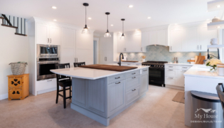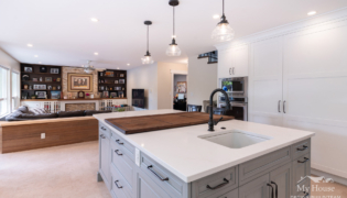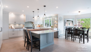 The entire kitchen was gutted and redesigned with one large, central island featuring ample storage and integrated appliances. Bright white cabinetry extends to the ceiling for maximum storage, while the island is a soft blue-grey, paired with crisp white countertops and bold black hardware and faucet accents.