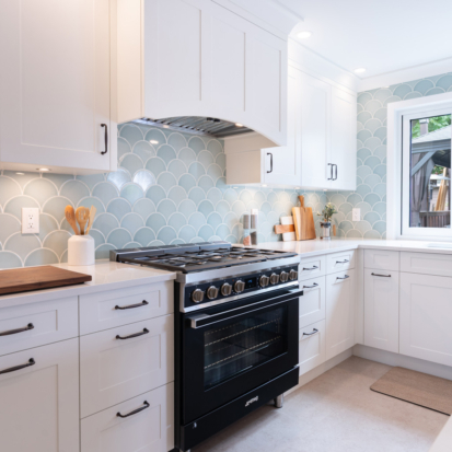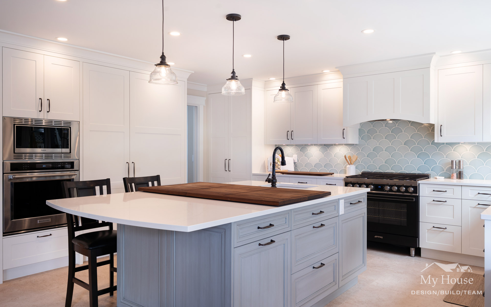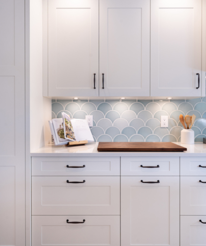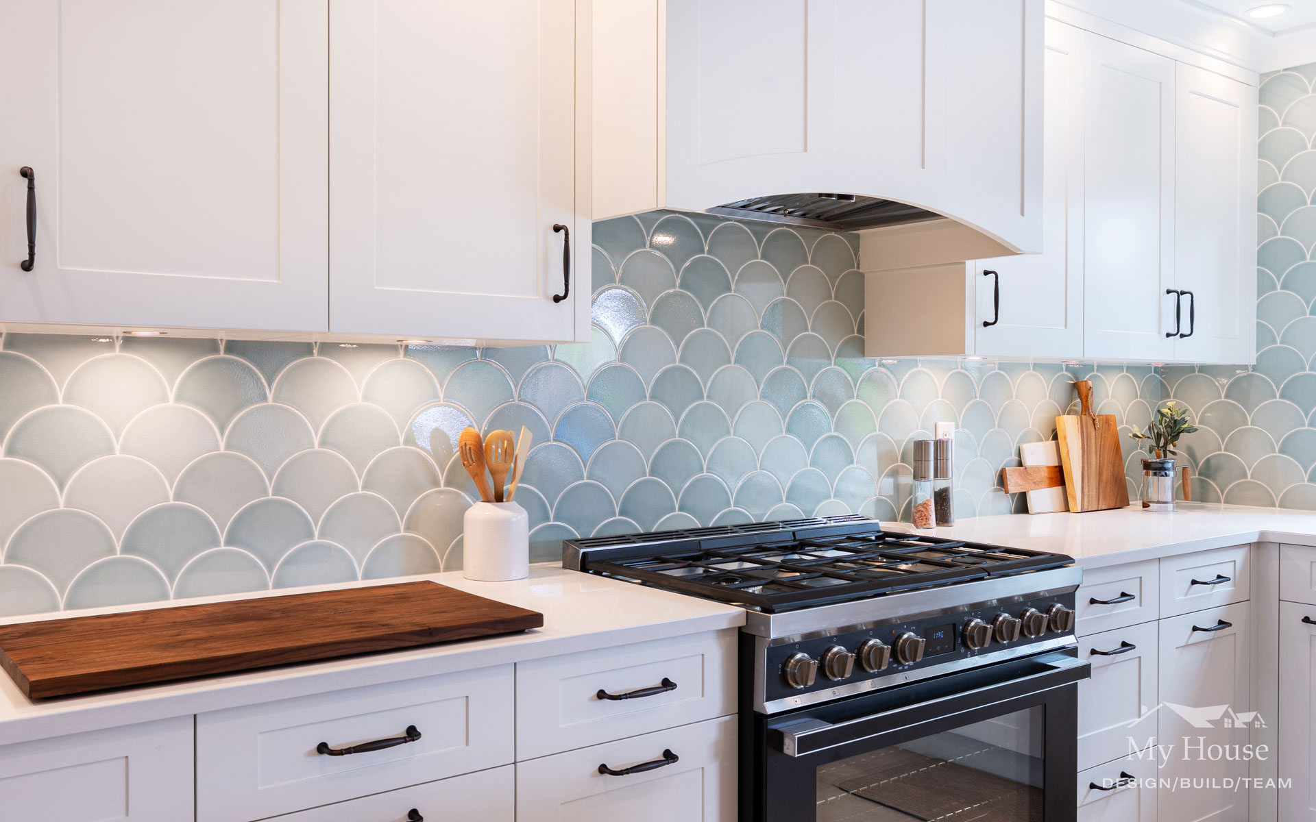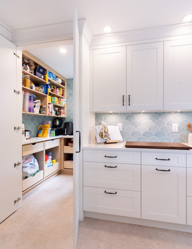 A playful, multi-colored scallop tile backsplash adds personality and charm, creating a striking focal point in the space. A built-in pantry was also incorporated, giving the family organized, accessible storage while maintaining a clean and cohesive design.