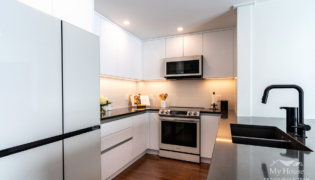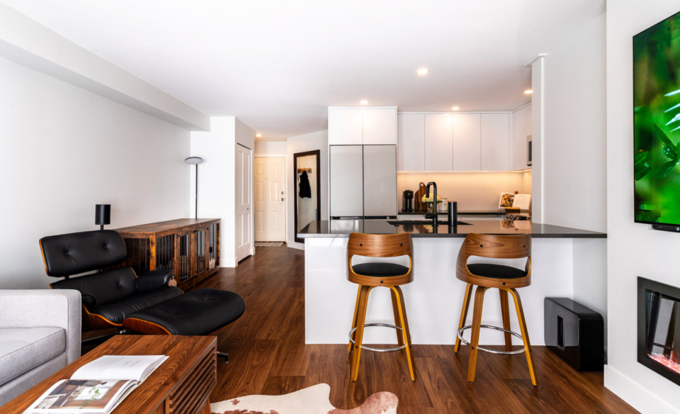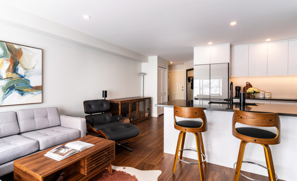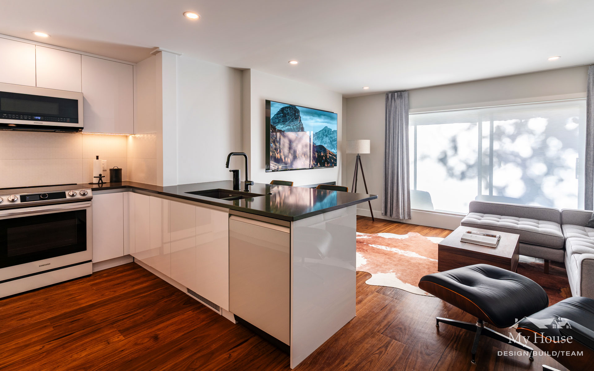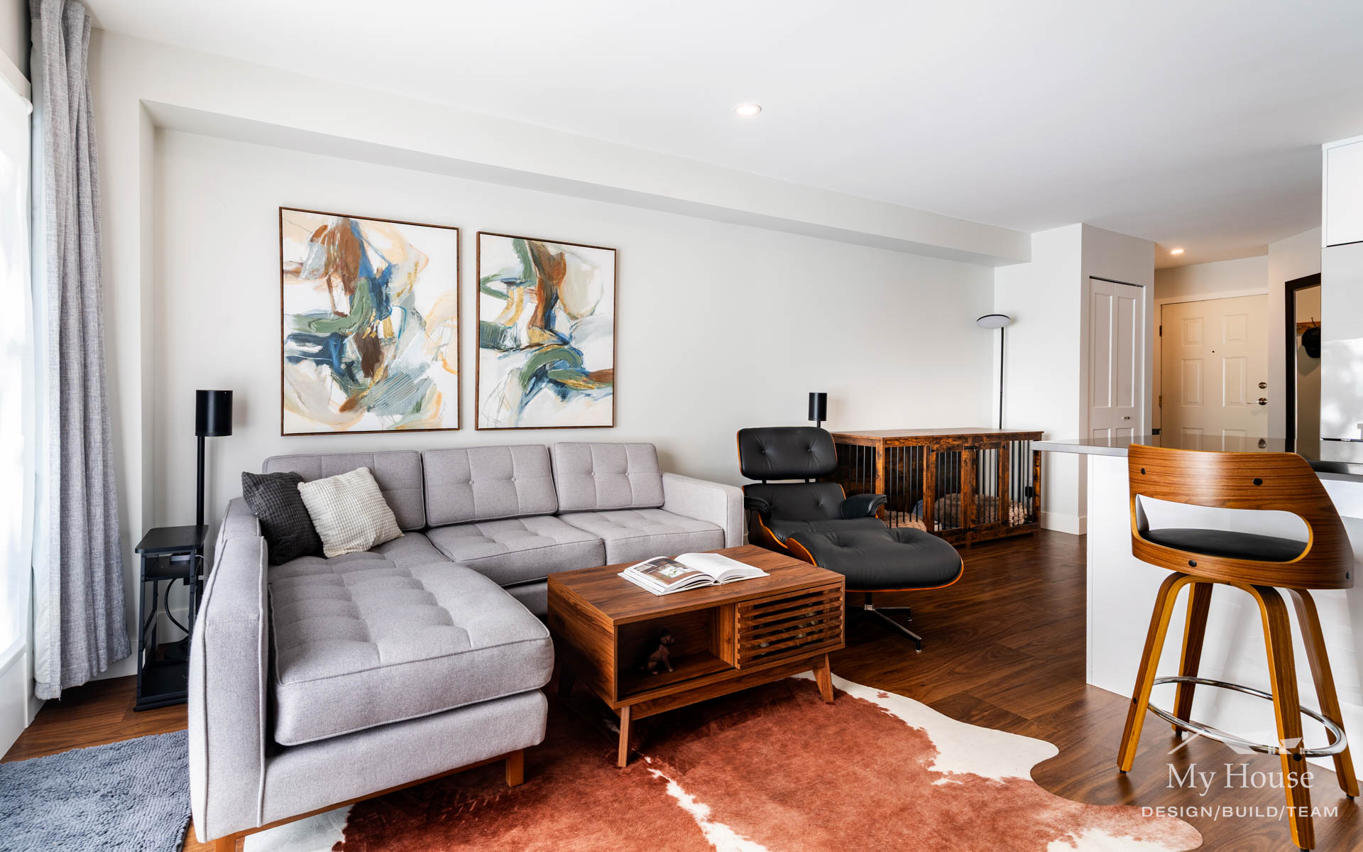 This condo renovation focused on transforming a closed-off, dated layout into an open, modern, and cohesive space.