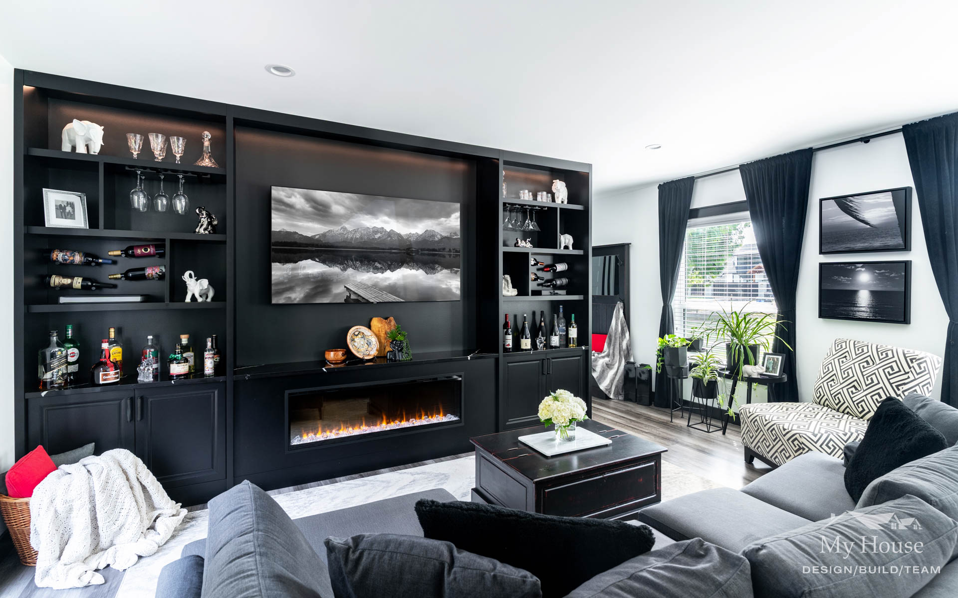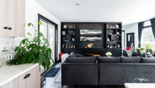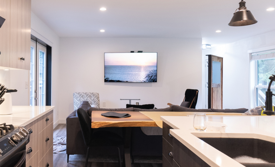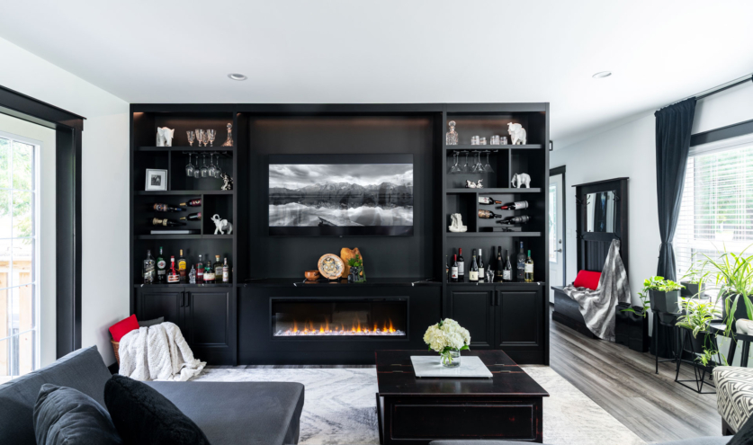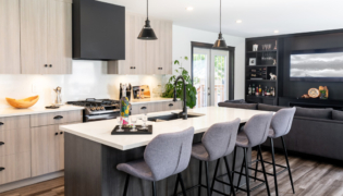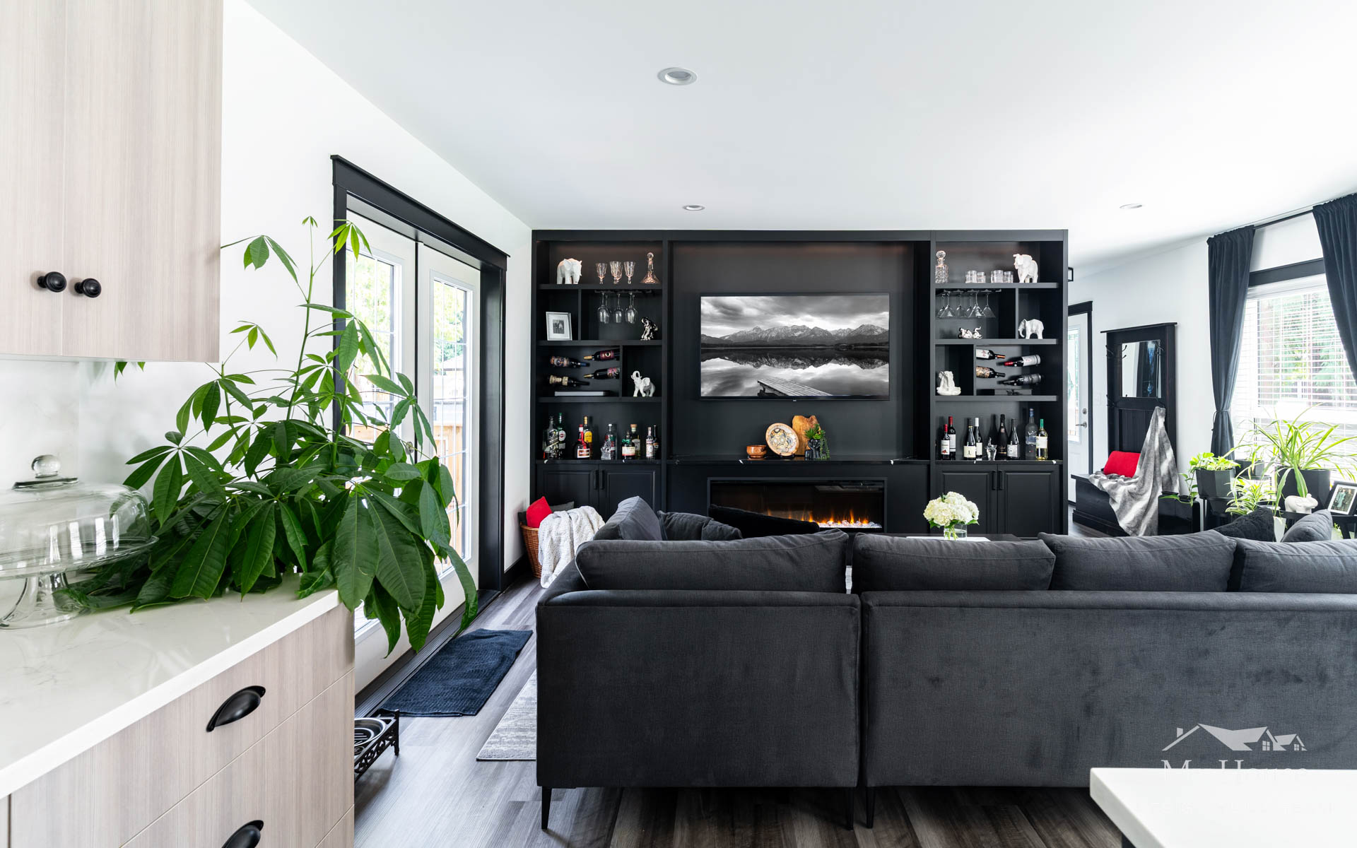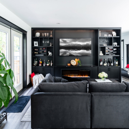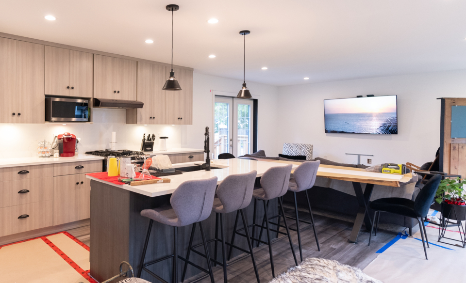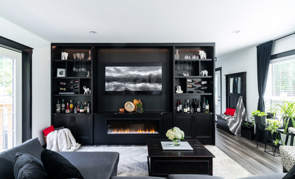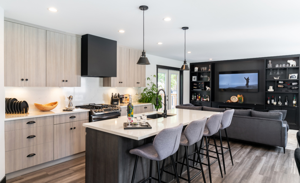 This project delivered a brand-new kitchen for our clients, combining enhanced functionality with striking finishes. Light cabinetry paired with dark accents creates a modern, bright, and inviting space. In addition, we added functional storage and a feature wall in the living room to tie in the dark features in the kitchen.