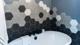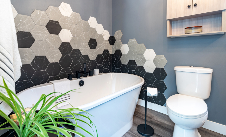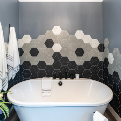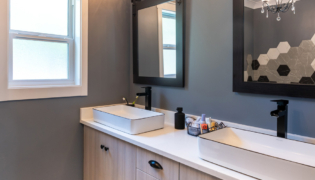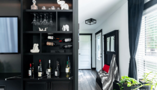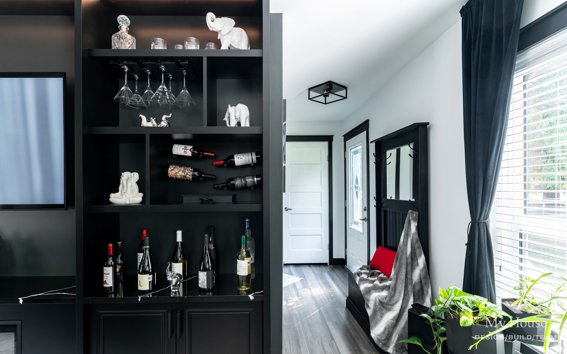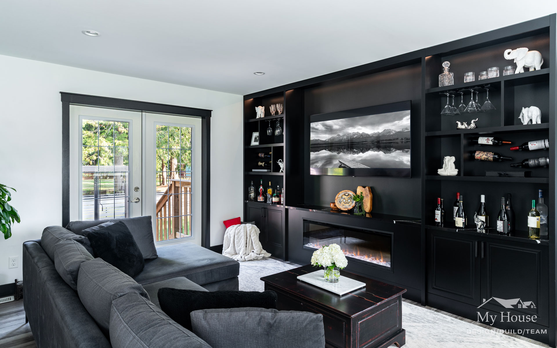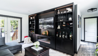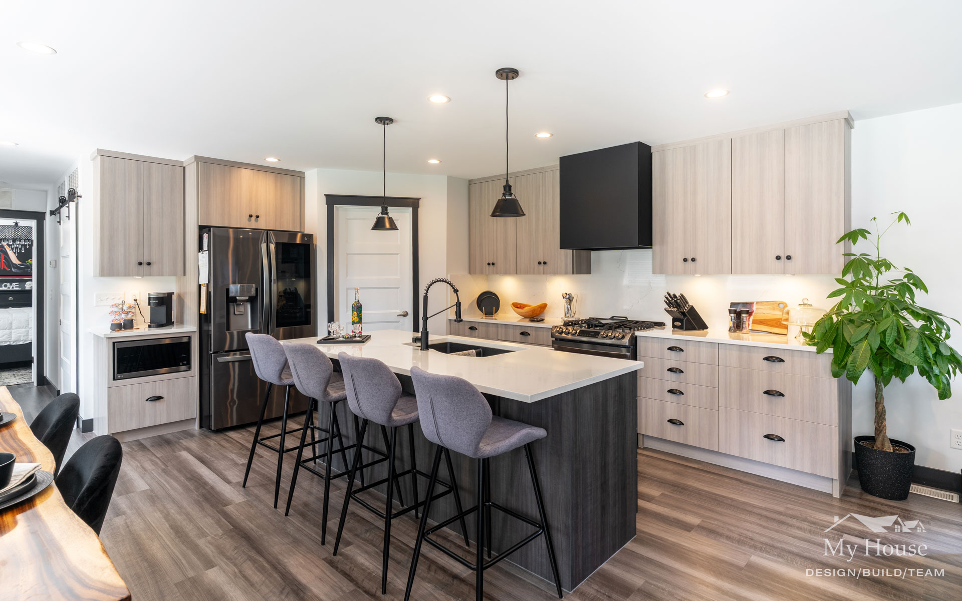 This project delivered a brand-new kitchen for our clients, combining enhanced functionality with striking finishes. Light cabinetry paired with dark accents creates a modern, bright, and inviting space. In addition, we added functional storage and a feature wall in the living room to tie in the dark features in the kitchen.