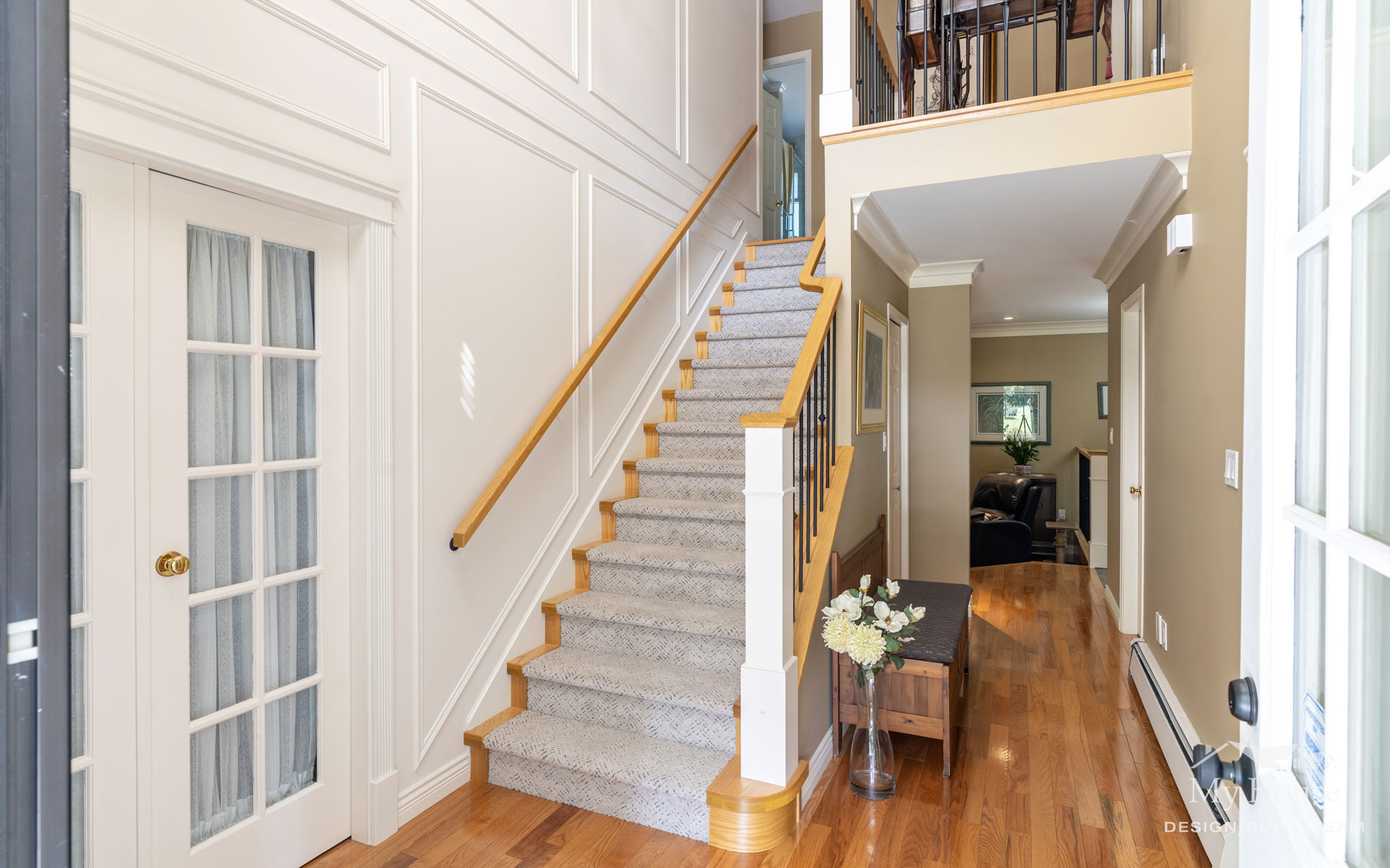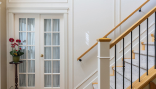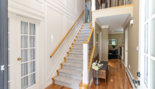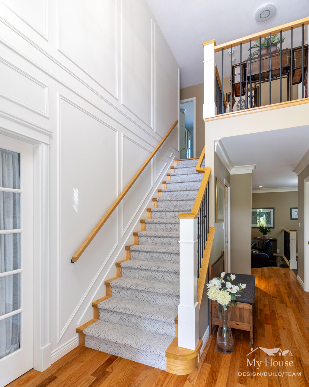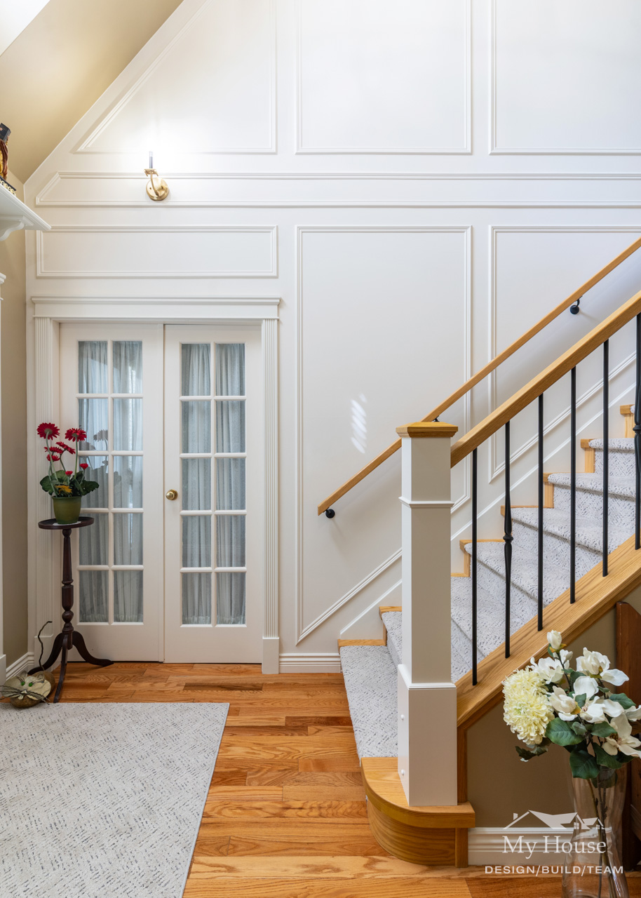 We also updated the staircase with floor-to-ceiling wainscoting, new railings, posts, and spindles. Durable, wool-inspired, pet-proof carpet completes the staircase, blending style and practicality throughout the home.