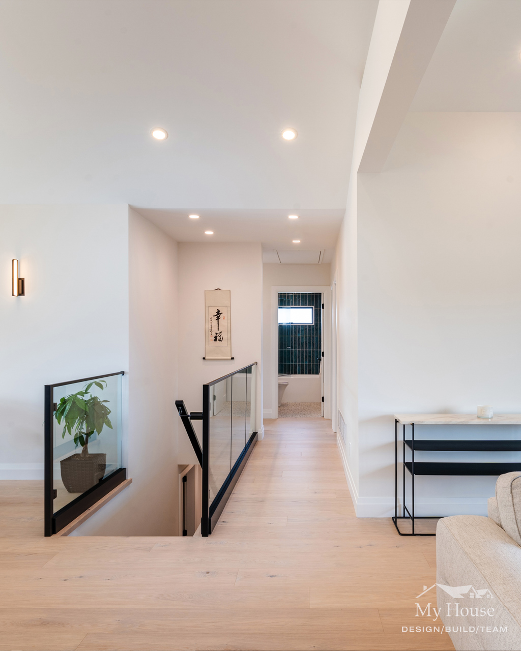 adorned with glass railings, to find a cozy powder room, office, and flex space, ideal for