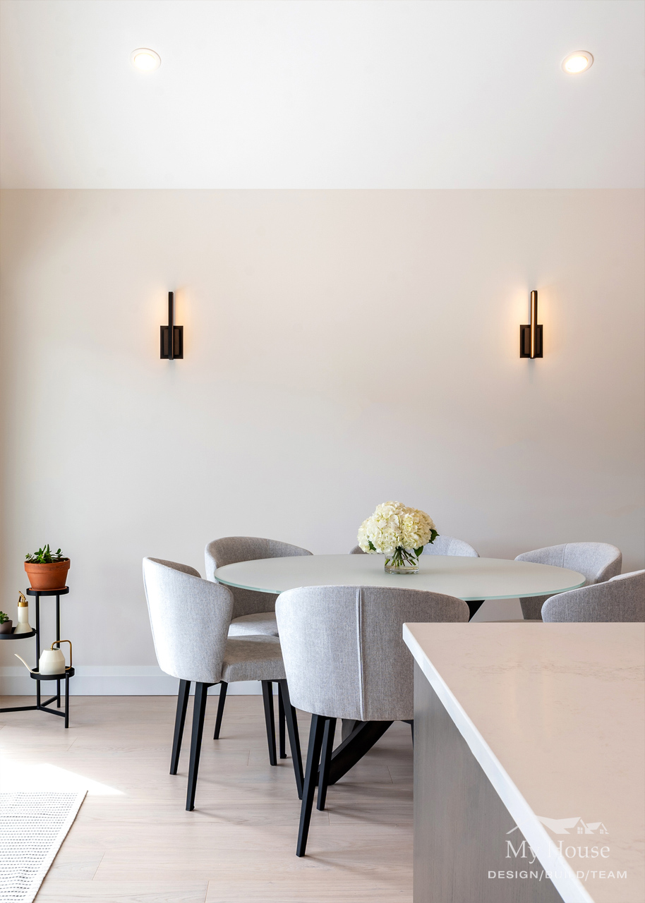 seamlessly integrates with the dining and kitchen spaces. Fresh new flooring runs