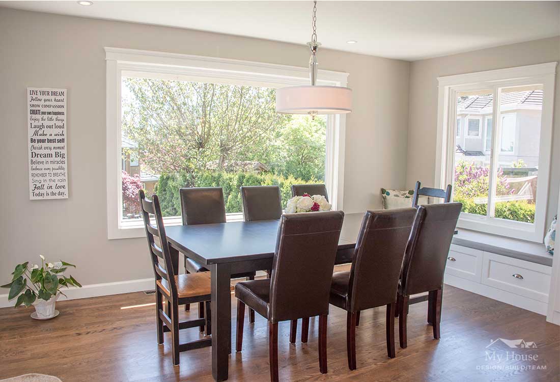 The dining room now lives along the back of the home between the kitchen and family room. More casual in location and feel, gone are the days of stuffy compartmentalized rooms. Large windows and a cozy bench seat make this new dining room bright and inviting.