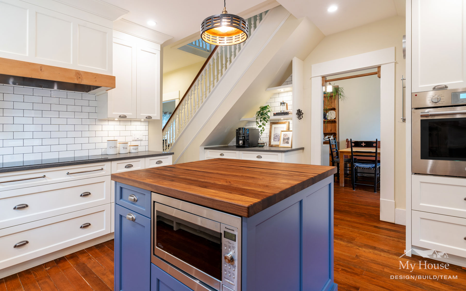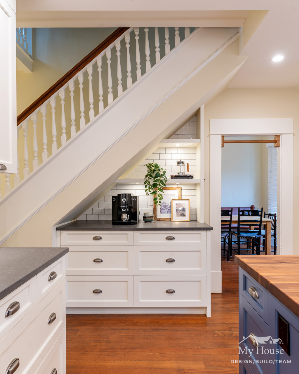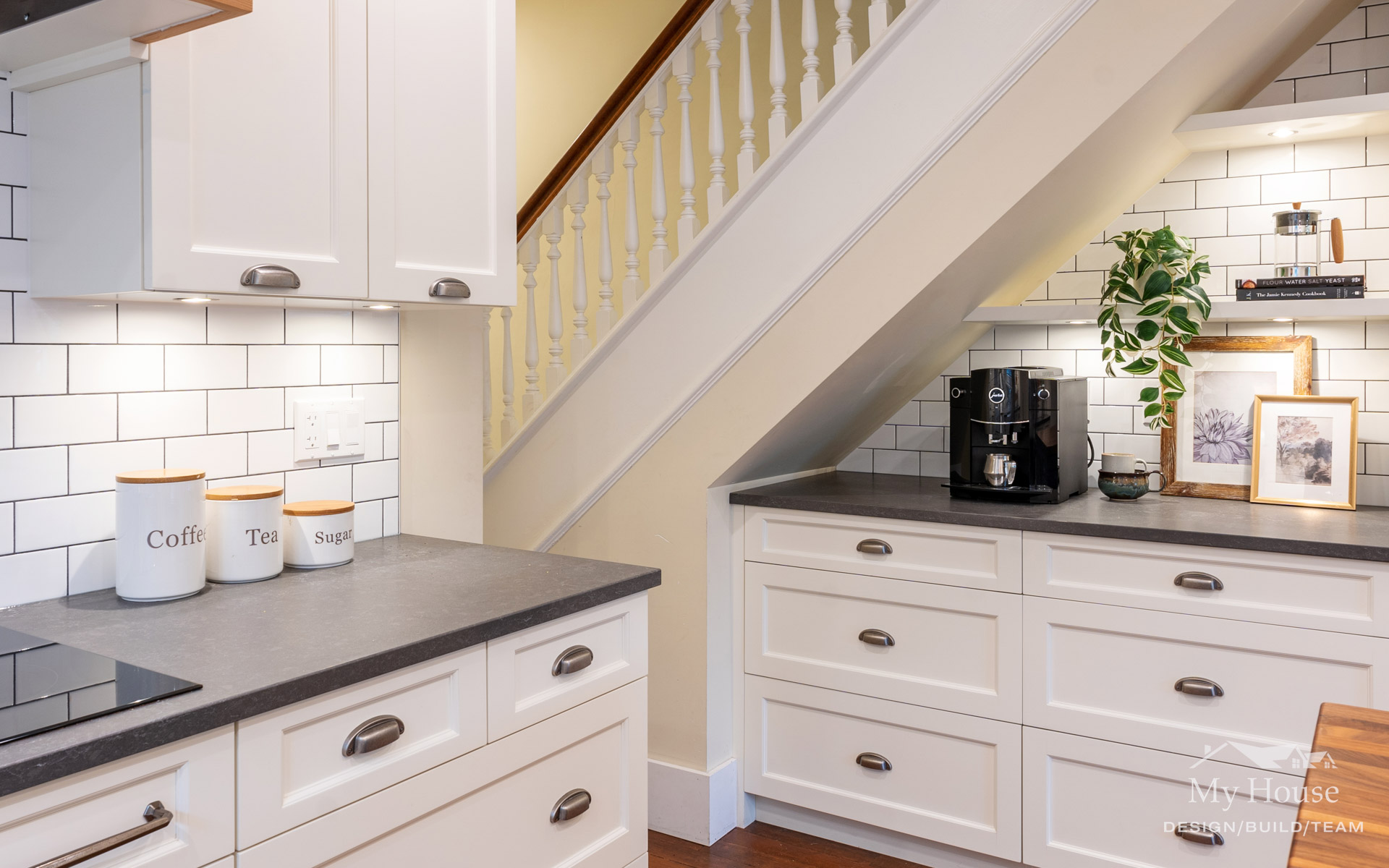 The heart of the home, the kitchen, was completely reimagined with a fresh and timeless design. Crisp white cabinets and a classic white subway tile backsplash create a bright and airy feel, while a striking blue island with a heritage-inspired butcher block countertop adds a pop of color and character. We thoughtfully designed a cozy storage and coffee nook under the stairs, maximizing space and functionality without compromising style. A charming farmhouse sink further enhances the kitchen’s vintage appeal.