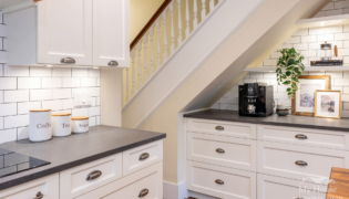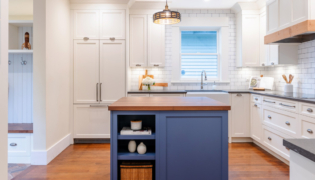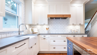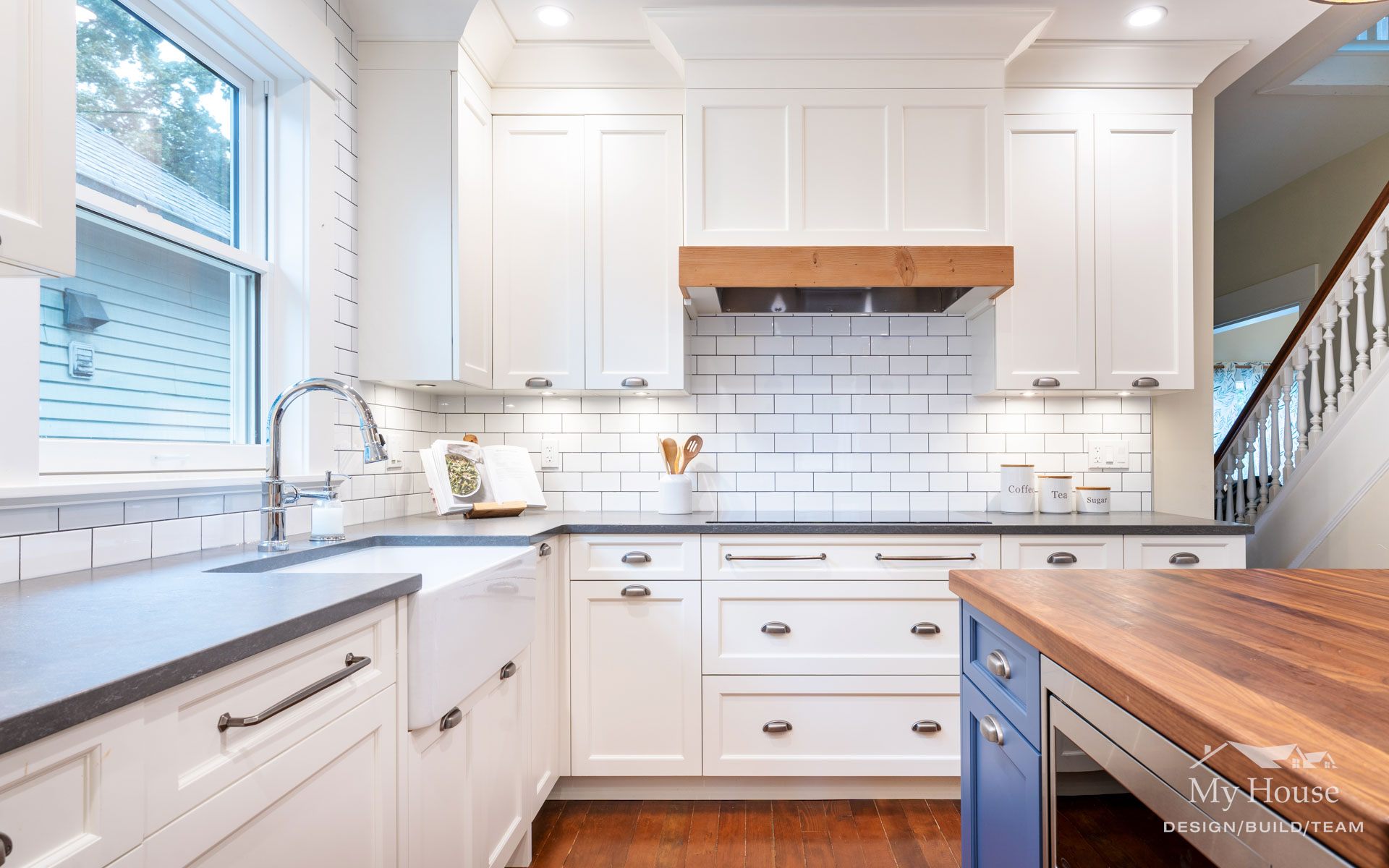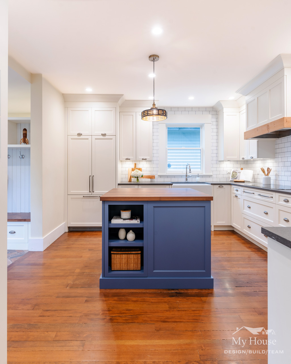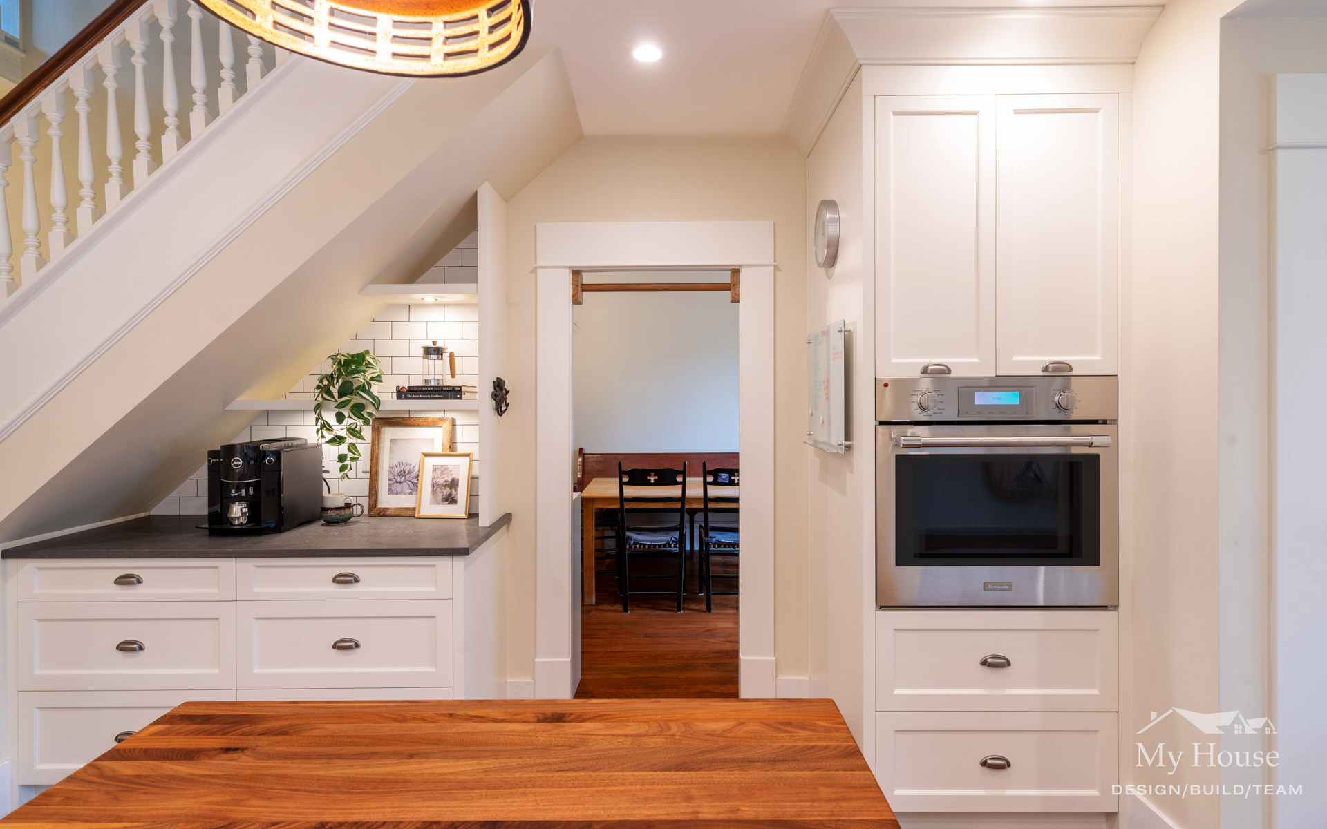 The heart of the home, the kitchen, was completely reimagined with a fresh and timeless design. Crisp white cabinets and a classic white subway tile backsplash create a bright and airy feel, while a striking blue island with a heritage-inspired butcher block countertop adds a pop of color and character. We thoughtfully designed a cozy storage and coffee nook under the stairs, maximizing space and functionality without compromising style. A charming farmhouse sink further enhances the kitchen’s vintage appeal.