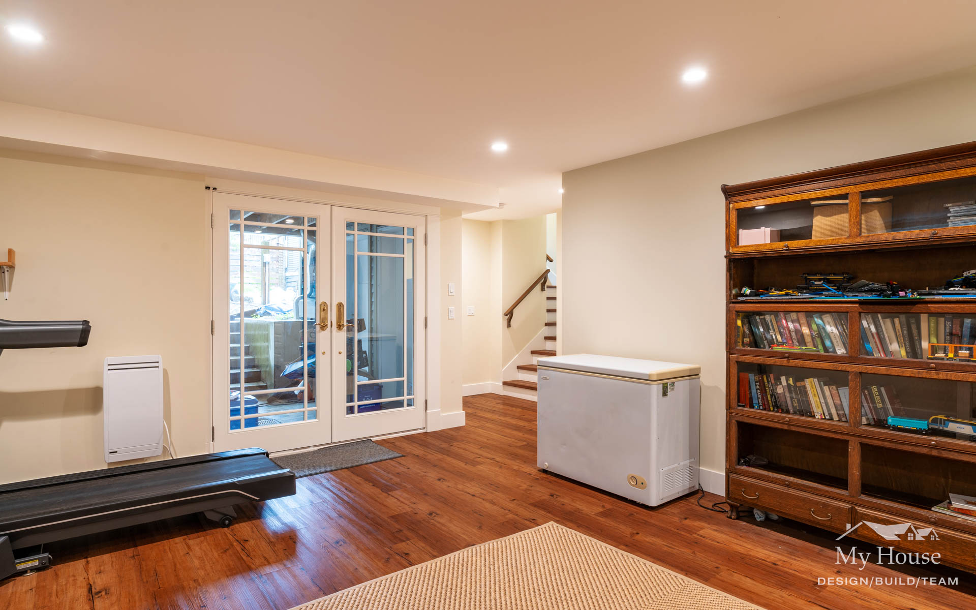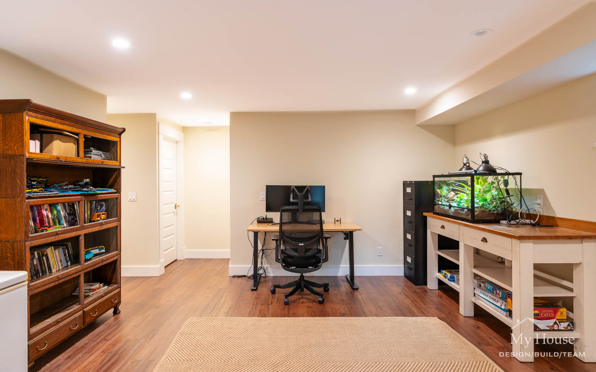 To maximize space, we lifted the entire house and dug out the basement, transforming it into a spacious, functional area with 8-foot ceilings—perfect for a new rec room that offers plenty of room to play and relax.