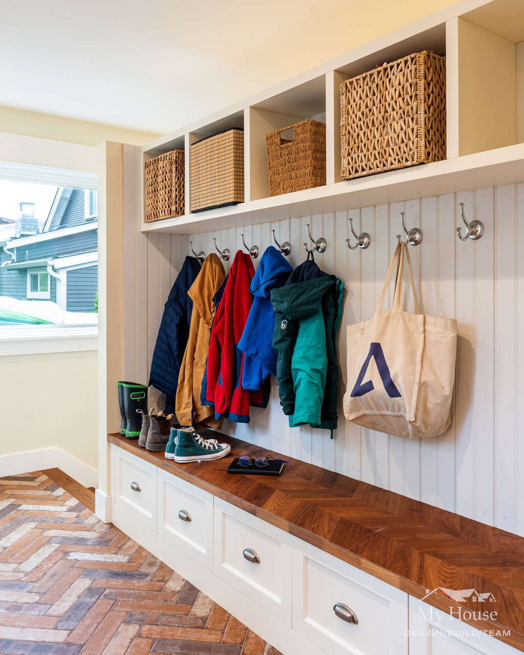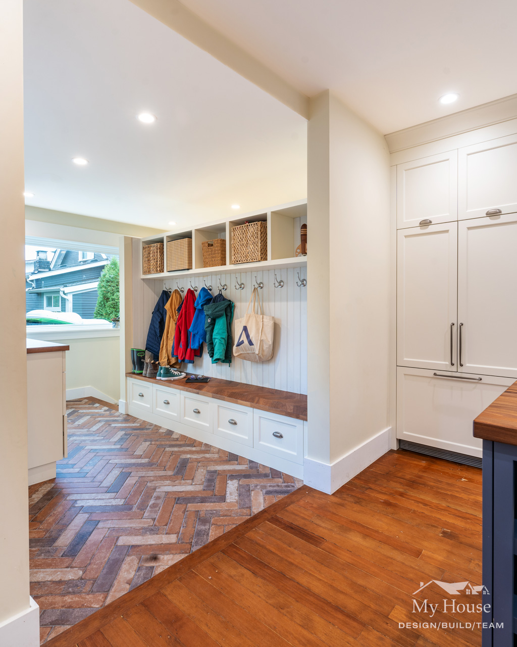 To improve flow and functionality, we removed the wall between the kitchen and mudroom, creating an open, welcoming space that suits the dynamic lifestyle of this busy West Coast family. We also added a staircase leading to the newly renovated basement, seamlessly connecting the old with the new.