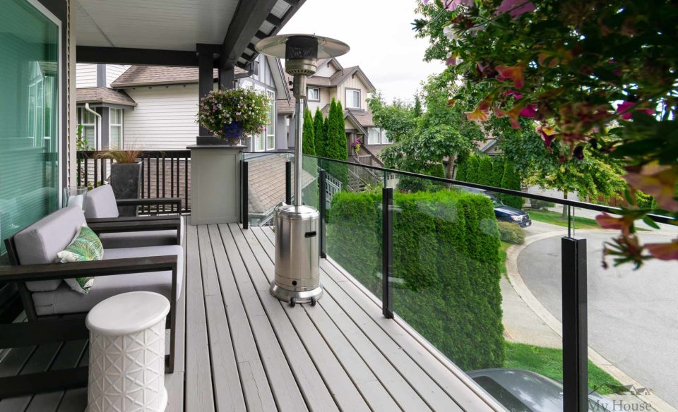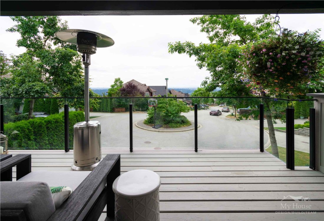 We also gave the front of the house a modernizing face lift. We repainted the teal blue trim a dark accent (Benjamin Moore Iron Mountain) and gave homeowners a stunning deep red front door (Benjamin Moore AF-300 Dinner Party). Their front porch flooring was restored and refinished with a coat of stain and we installed a clear glass railing so the family can have an unobstructed view of the quiet cul-de-sac and valley below.