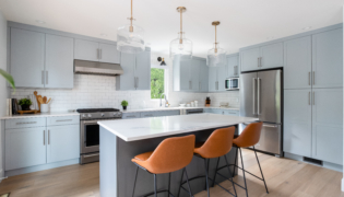 On the exterior, the home received a fresh update with new windows and siding, enhancing curb appeal and energy efficiency. Inside, the kitchen was completely reimagined, replacing dark wood cabinets with a beautiful light blue design, paired with a crisp white backsplash.