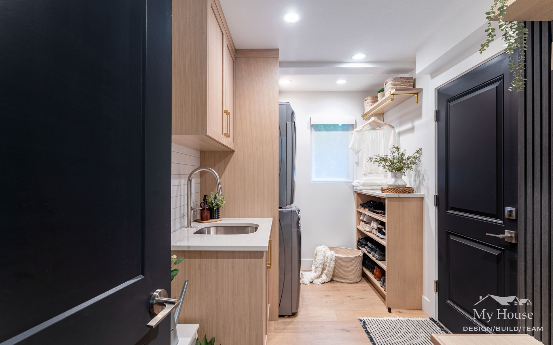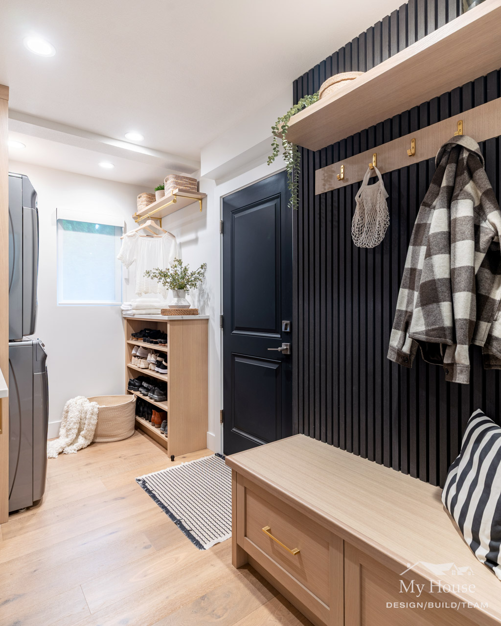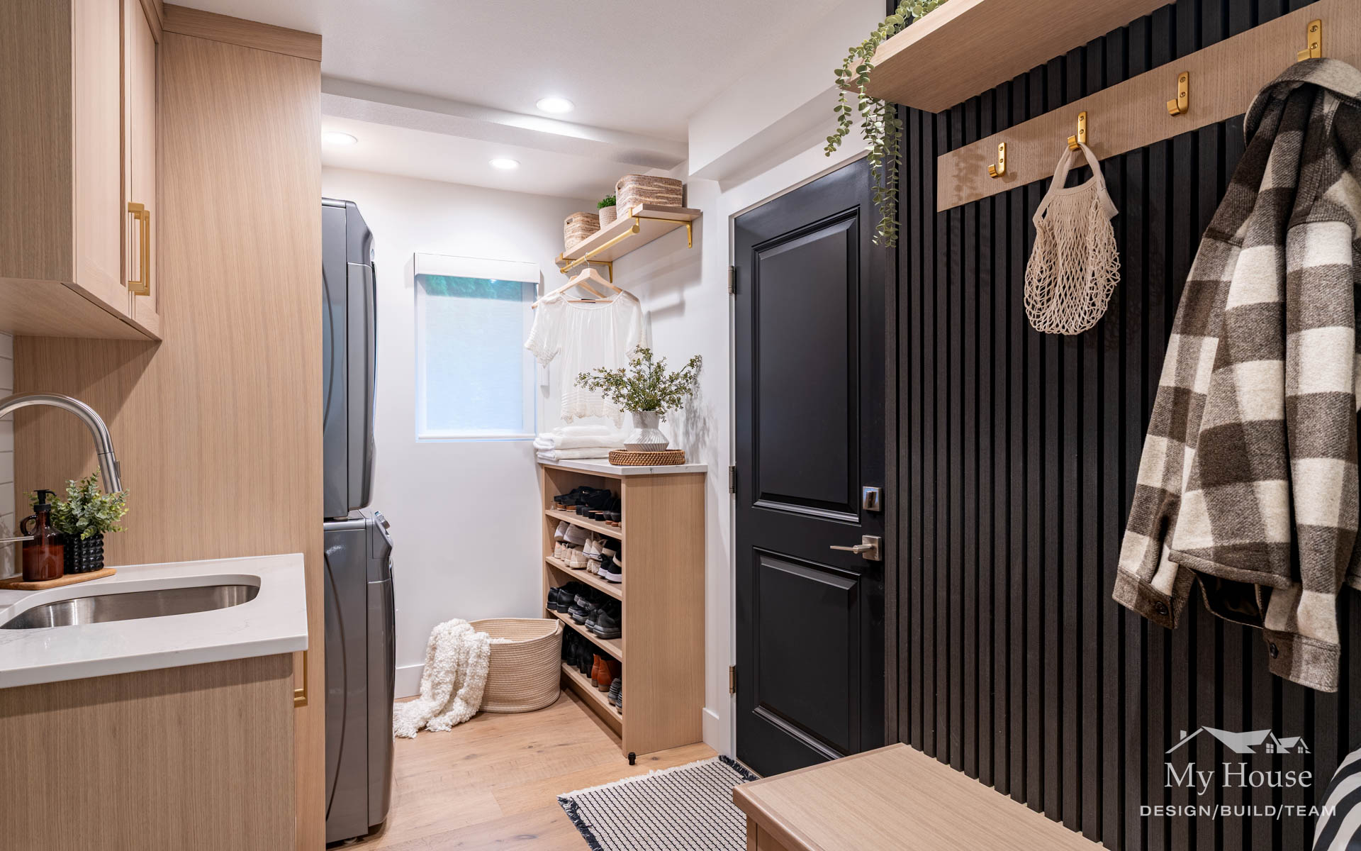 The mudroom was transformed into a practical yet chic space, featuring a striking black accent wall, custom storage, and hooks to keep everything organized. The washer, dryer, and sink were seamlessly integrated, and additional storage ensures a clutter-free, functional area for daily use.