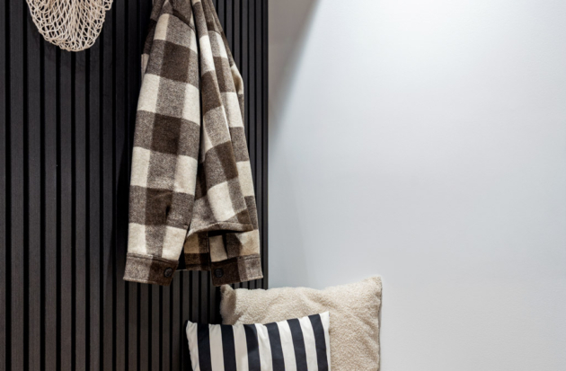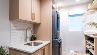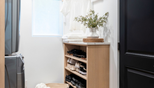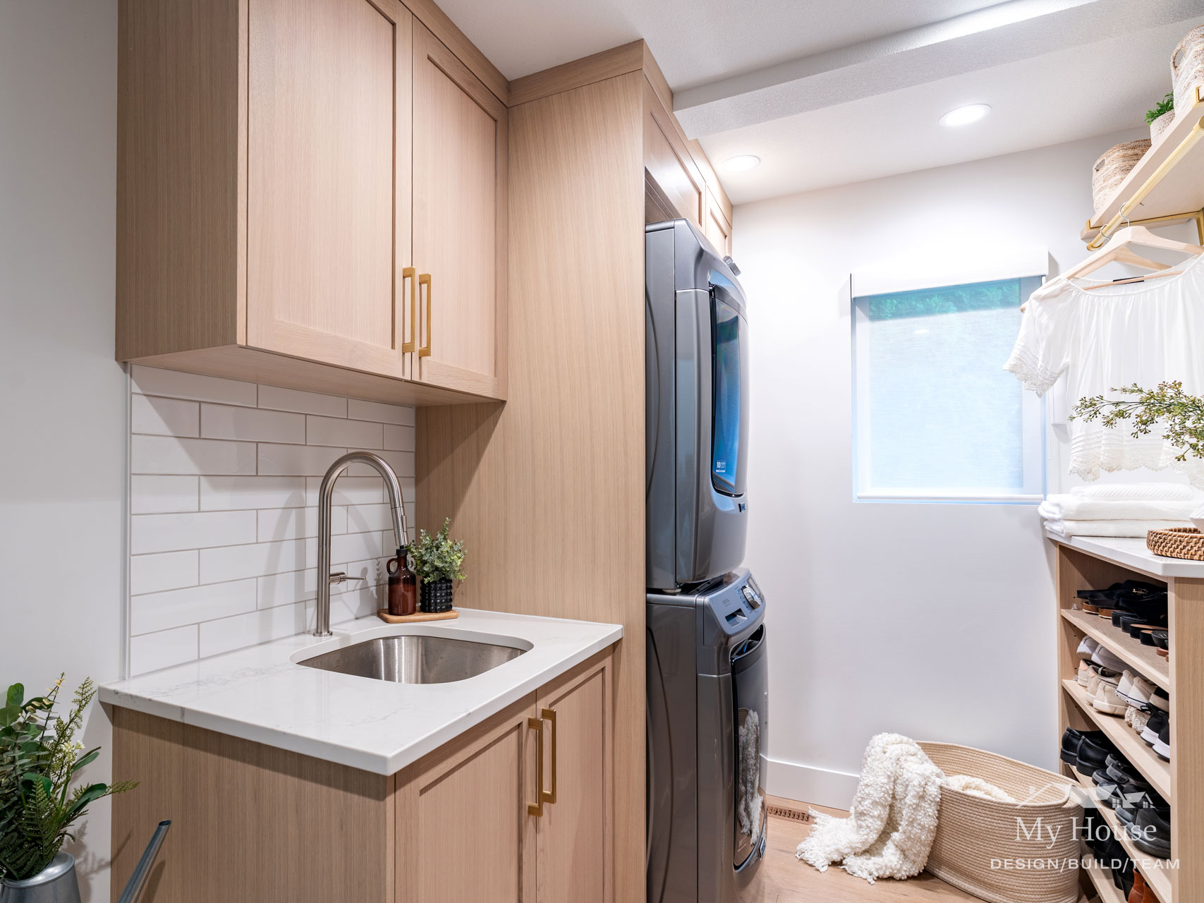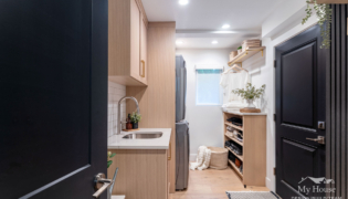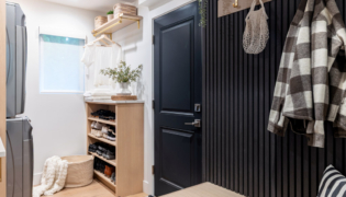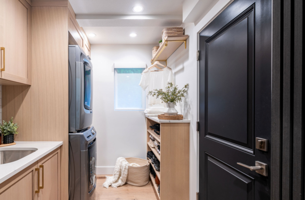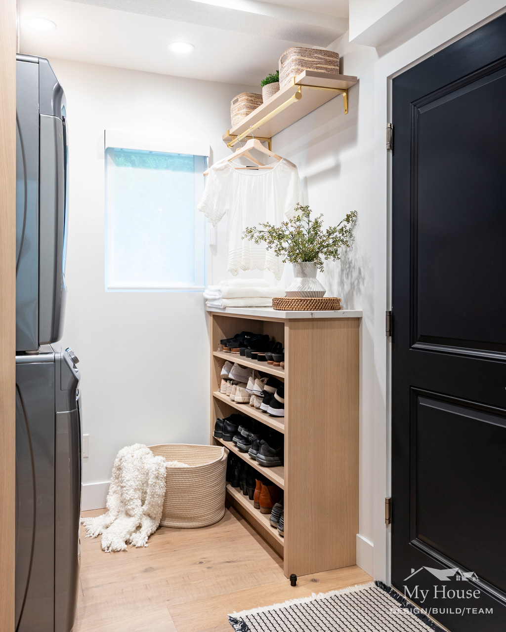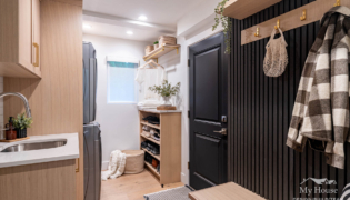 The mudroom was transformed into a practical yet chic space, featuring a striking black accent wall, custom storage, and hooks to keep everything organized. The washer, dryer, and sink were seamlessly integrated, and additional storage ensures a clutter-free, functional area for daily use.