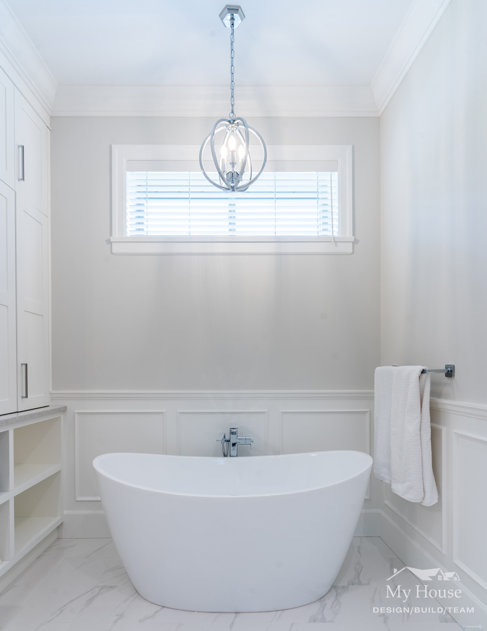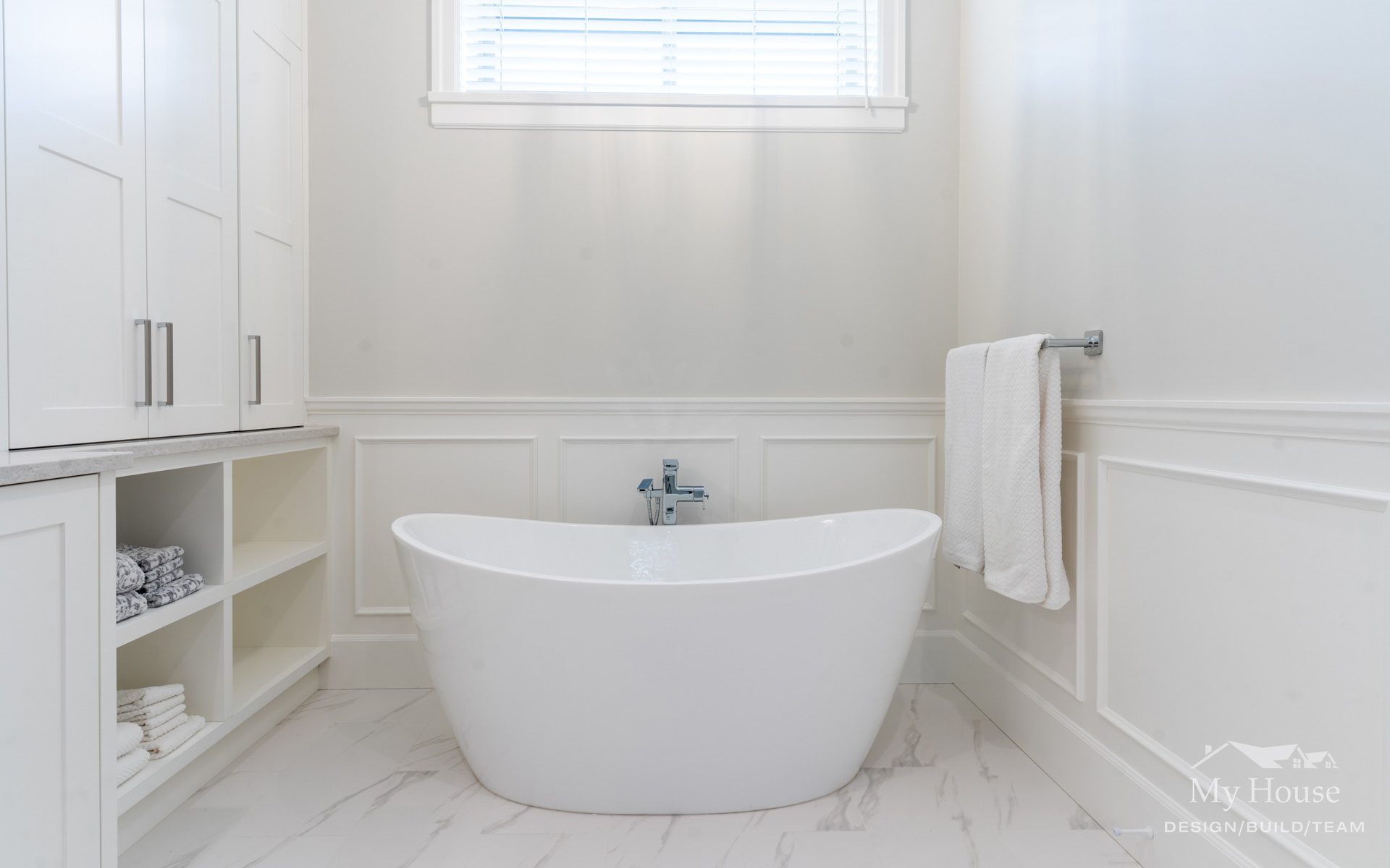 A freestanding tub became the centerpiece of the space, complemented by a sleek glass shower, double vanity, and ample storage. This transformation turned a once dreary space into a stunning retreat.