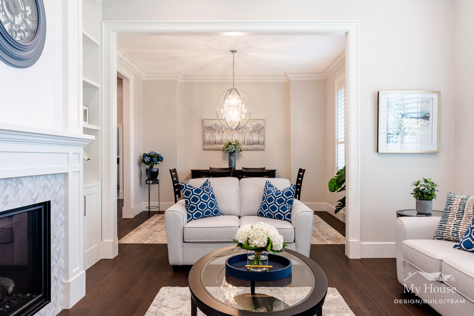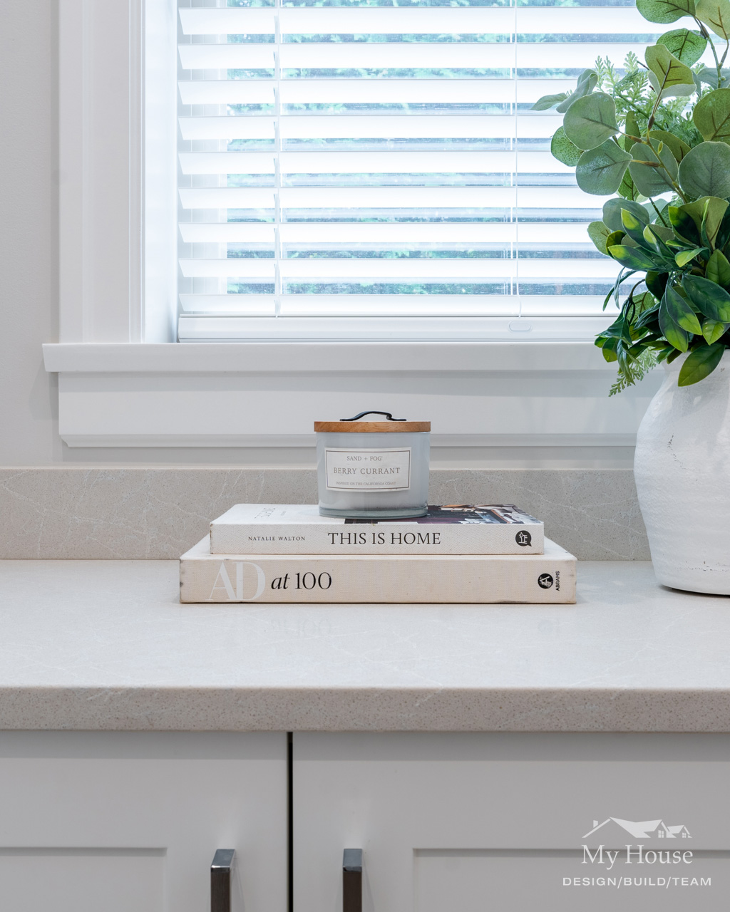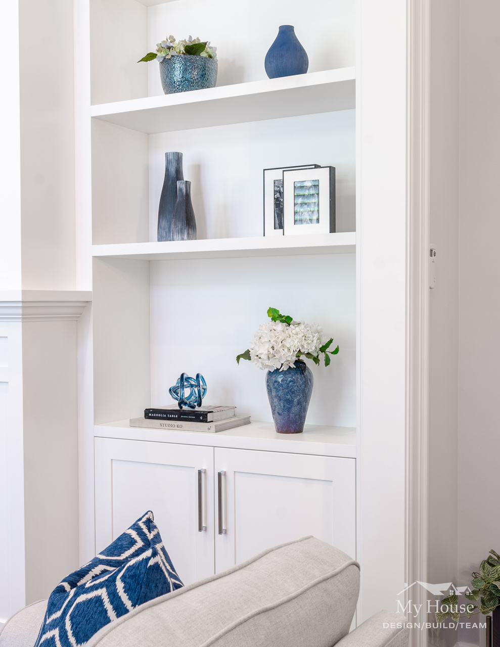 The living room, with its charming structure, was transformed with a fresh coat of crisp white paint throughout the home. The fireplace, once dated, was refaced to create a more contemporary look, while still honoring the original design. Beneath the fireplace, custom storage was added to showcase the homeowners’ cherished keepsakes, marrying both form and function.