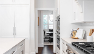We updated the cabinetry with clean, white finishes and complemented them with fresh, crisp countertops. A showstopping range hood became the focal point of the space, providing a modern touch to an otherwise classic kitchen.