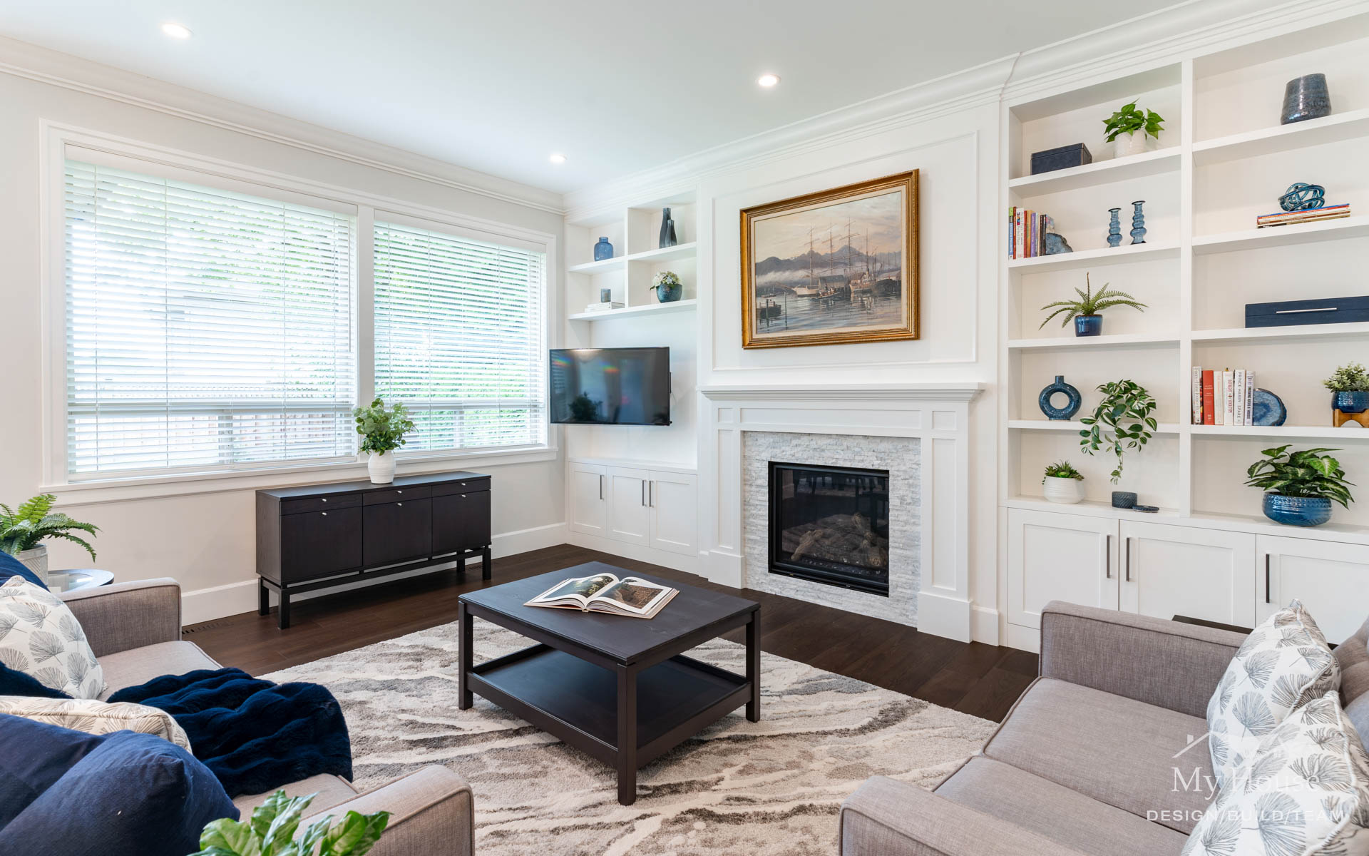 The second fireplace was also given a modern update with a new face, blending seamlessly into the newly refreshed space. More open and closed storage options were incorporated around the fireplace, offering both style and practicality for the family’s needs.