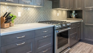 To update the kitchen, all new Nickels cabinets were installed in a grey stain. We extended the cabinets to the ceiling for additional storage, to cover up the bulkhead, and provide a streamlined look. Ceramic Moroccan style tiles create the new backsplash and pair well with the new, easy to maintain quartz countertop.