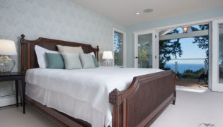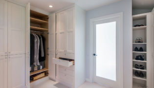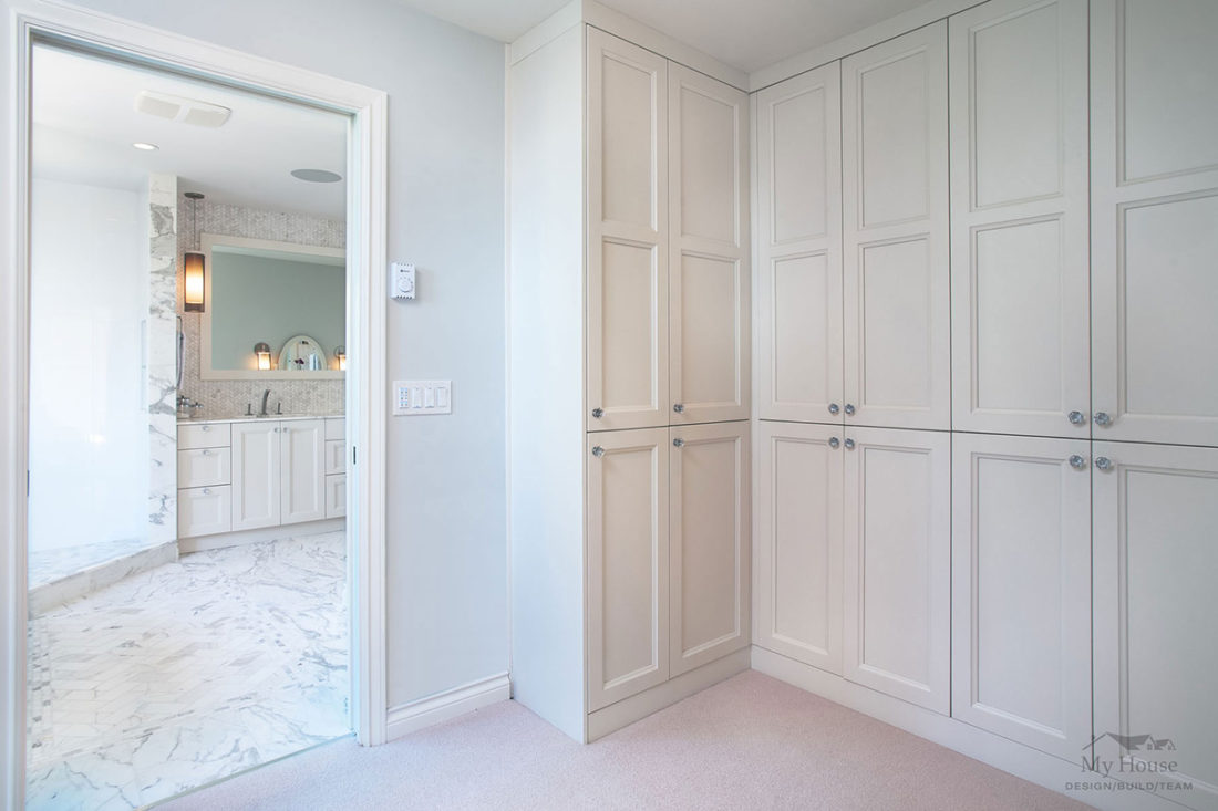 The Master Ensuite is the gem of the whole project. Where the bathroom was once functional yet crowded, walls were taken out and plumbing moved so now the large tub is positioned beneath the view window. The new crisp, white, luxurious bathroom is fitted with marble from floor to ceiling, and white walls, tiles and cabinets help create a sanctuary space for the homeowners. The large viewpoint window, stand-alone bath, rain head shower and crystal accents lend to the extravagant atmosphere created.