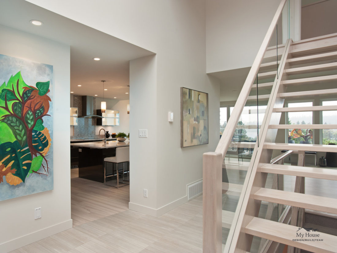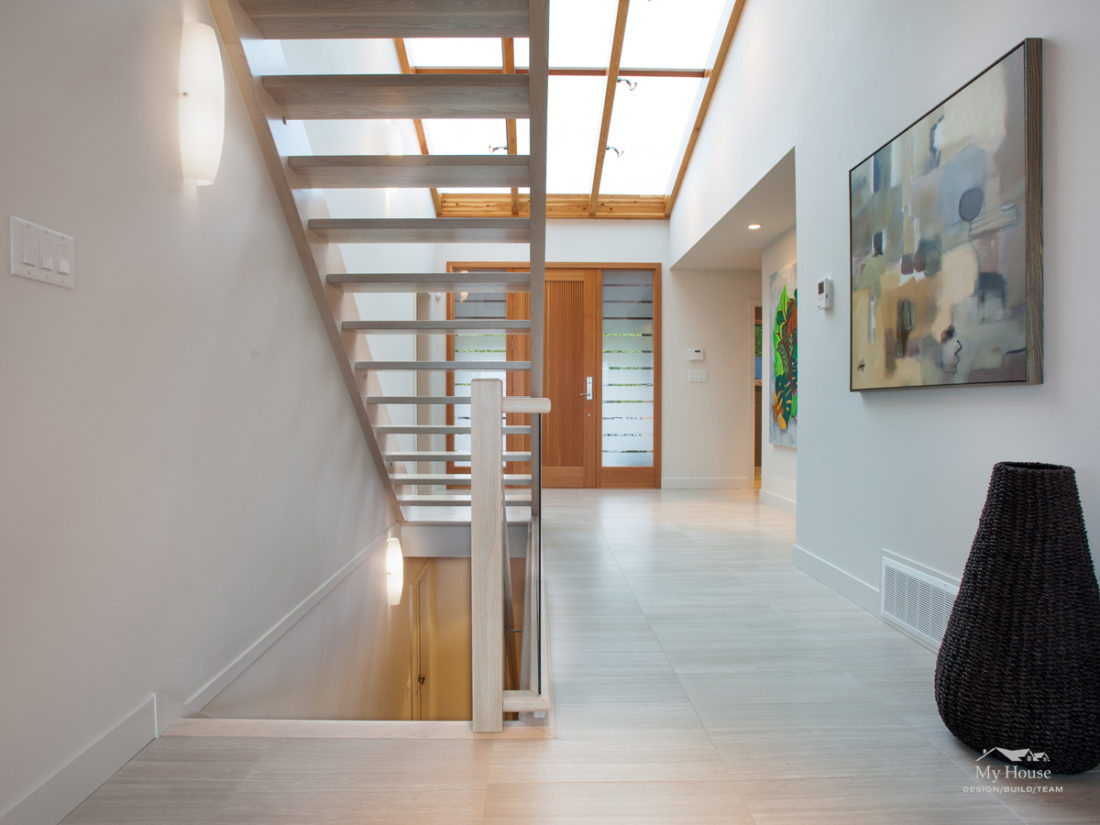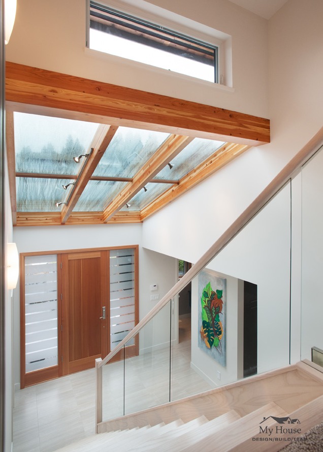 To maintain a more natural flow, we raised the main entryway floor to eliminate the two steps to the kitchen, so the floor is now one level. We also brightened up the entryway with a glass and glu-lam skylight adding light as well as a west coast feel.