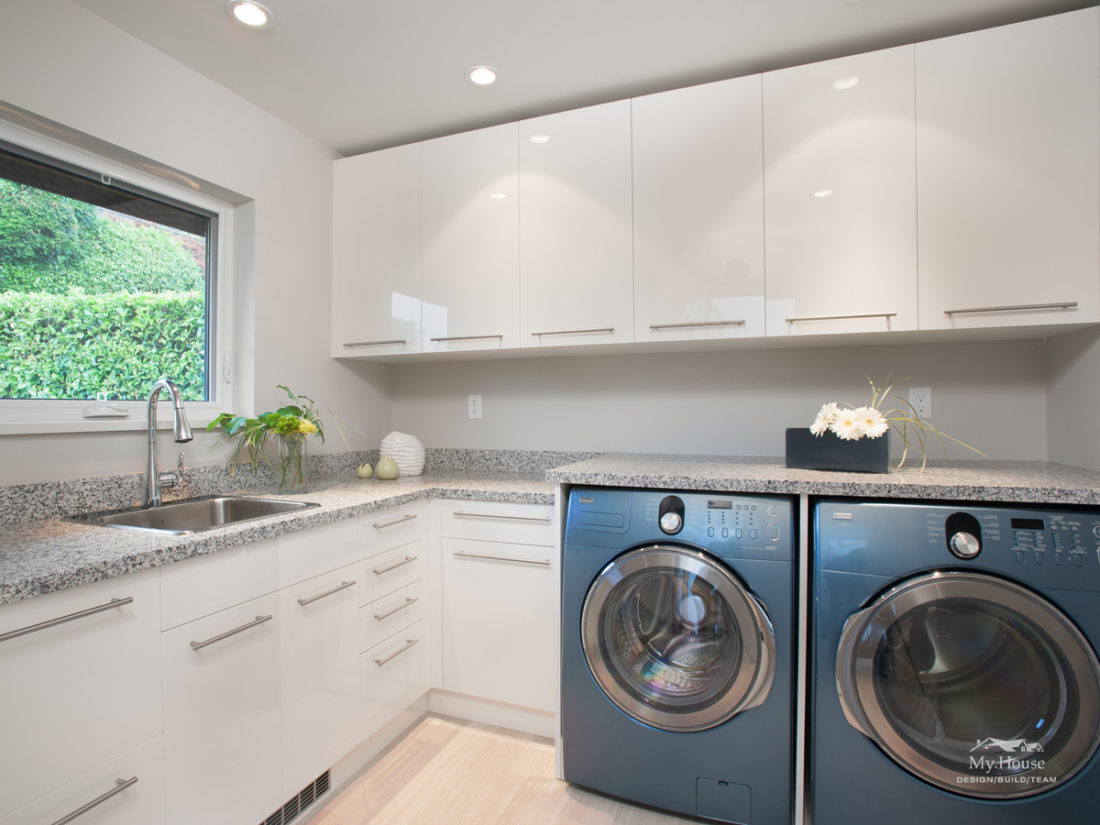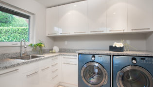 When you enter the home, the foyer, powder room, and laundry room was redone using large format porcelain tiles throughout. In the kitchen, the cabinets doors are made from custom polyurethane high-gloss doors in black, which complement the quartz kitchen countertops and backsplash.