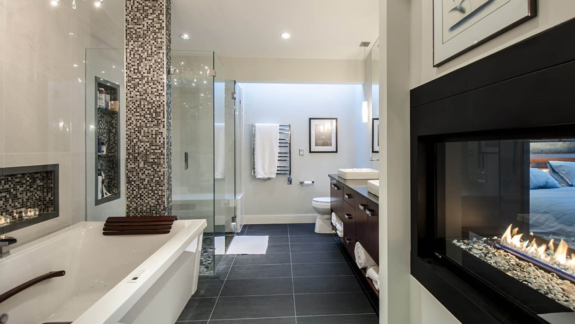 The master bedroom features an open concept ensuite, complete with a skylight brightening the room, a modern soaker tub, curbless shower with a bench, and a striking 3-sided fireplace separating the ensuite from the bedroom.