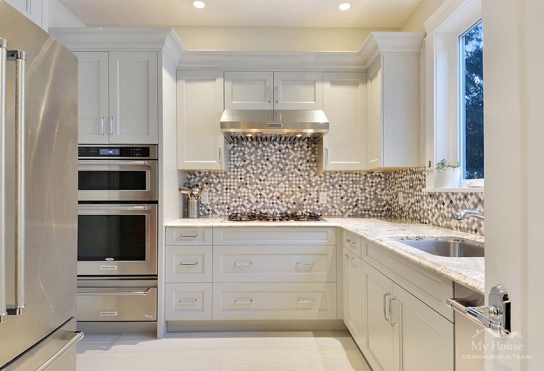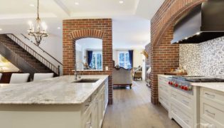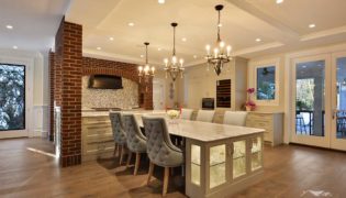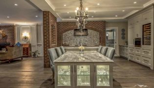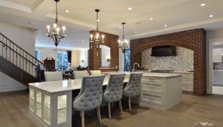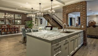 This kitchen was designed to be the hub of the home. Whether eating a family dinner, or entertaining a large group of guests, its layout and counter space can accommodate it all. The most unique feature is its T shaped island. A dining table was designed into the island so that guests can chat with the chef as meals are prepared. Its paneled appliances, brick arches, wine fridge, and ample display shelving make this space one of a kind.