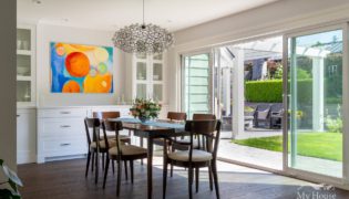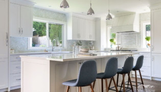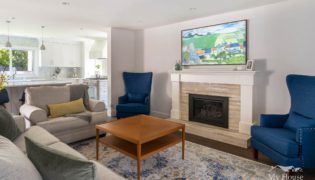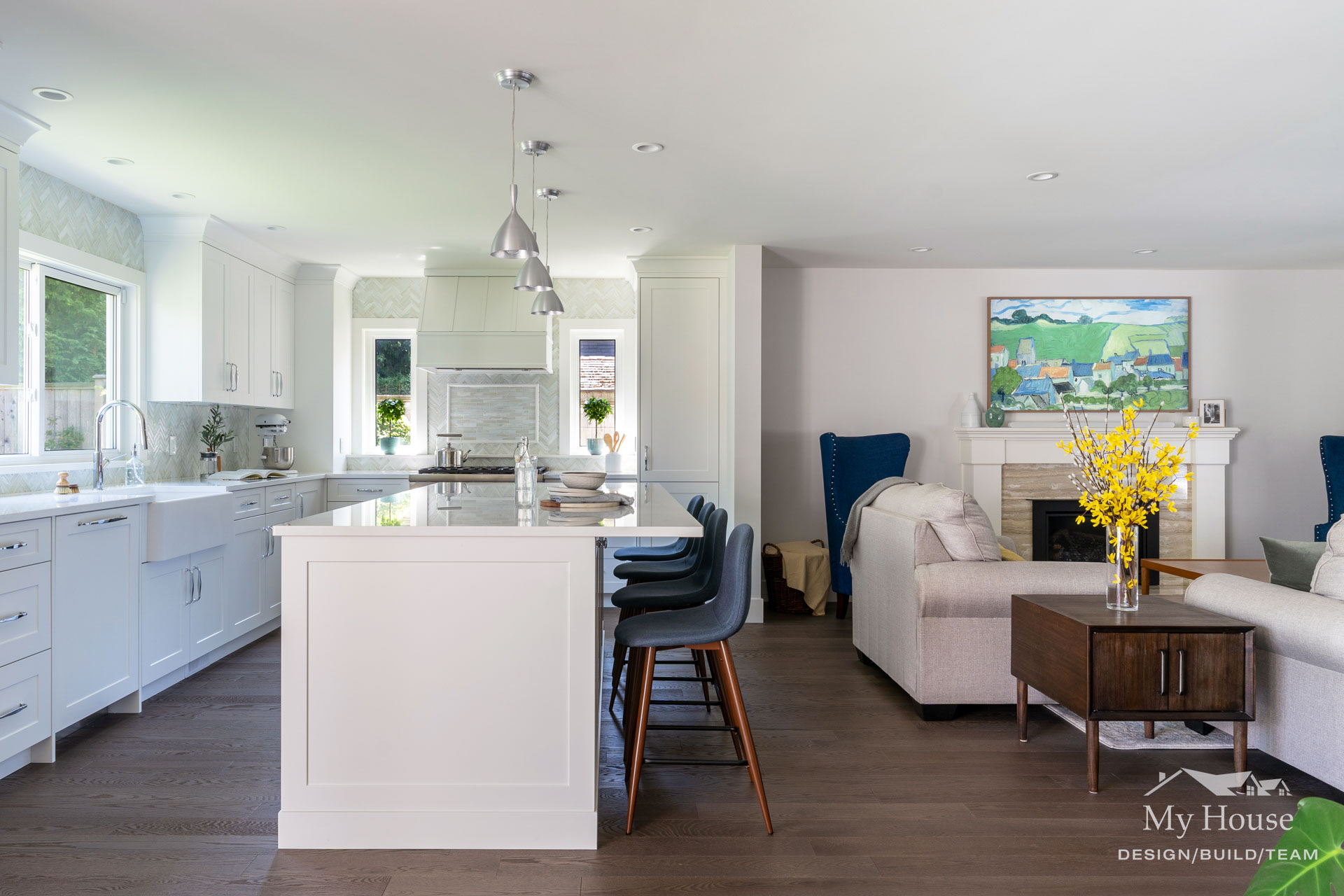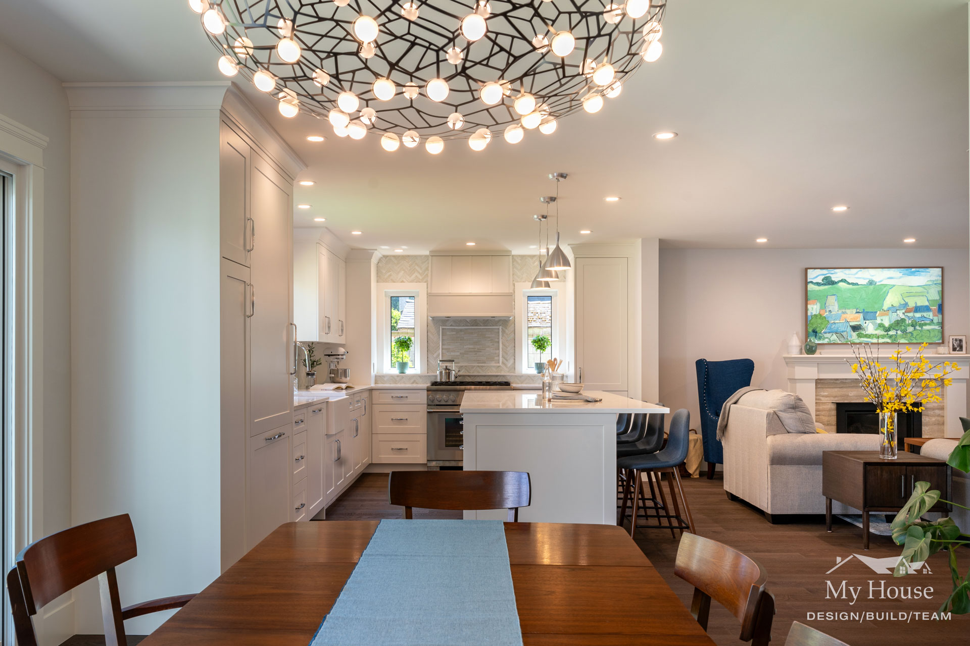 At the heart of this renovation lies the stunning kitchen and dining room, where the focus is on creating a seamless flow and a warm, inviting atmosphere. The custom hood fan immediately catches your eye, adding a touch of sophistication to the space. Natural light floods in from the surrounding windows, highlighting the exquisite glass herringbone backsplash and creating a modern yet timeless look. The dining room, with its large sliding glass doors and custom built-ins, seamlessly connects the indoor and outdoor areas, making it an ideal space for entertaining or enjoying family meals.
